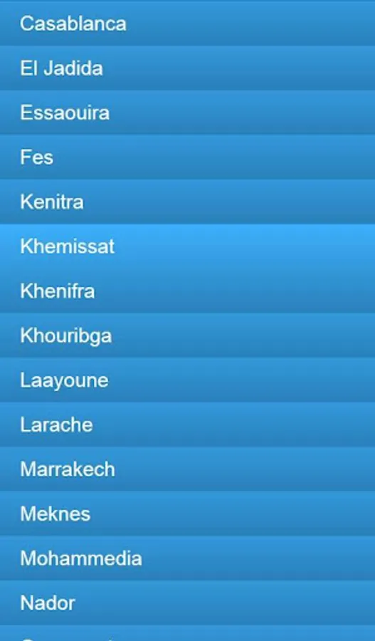 Agadir, Beni Mellal, Casablanca, El Jadida, Essaouira, Fes, Kenitra, Khemissat, Khenifra, khouribga, Laayoune, Larache, Marrakesh, Meknes, Mohammedia, Nador, Ouarzazate, Oujda, Rabat, Safi, Salé, Tangier, Taza, Tetouan.