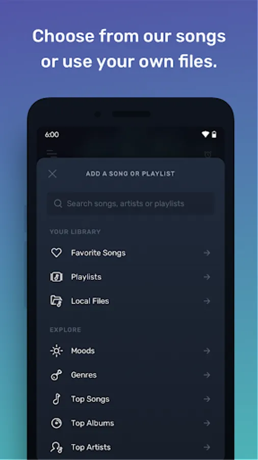 β Choose the appropriate song by selecting Mood, Genres, Top Songs, Top Albums, and Artists.