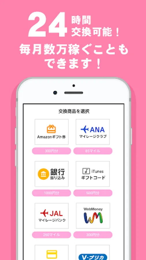 The points you have earned can be exchanged not only for cash, but also for various types of vouchers and points such as Amazon gift certificates, WebMoney, and GoglePlay gift cards.