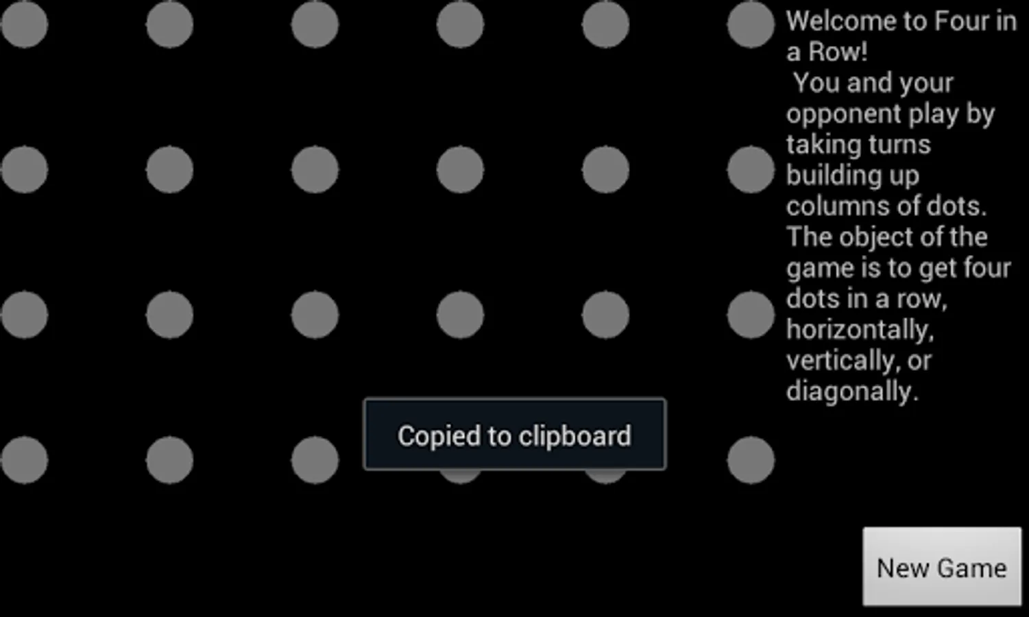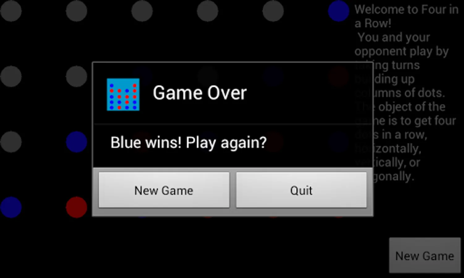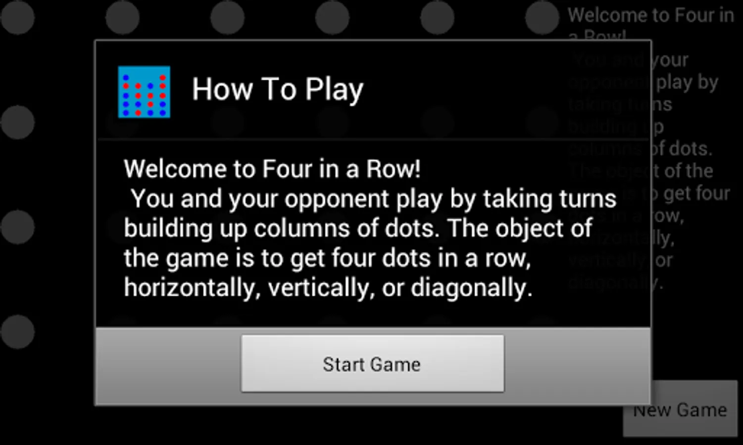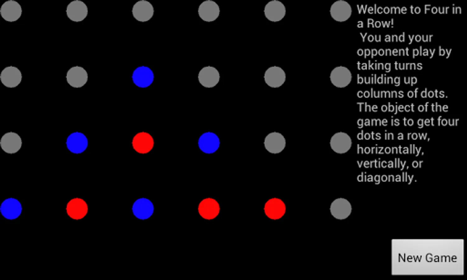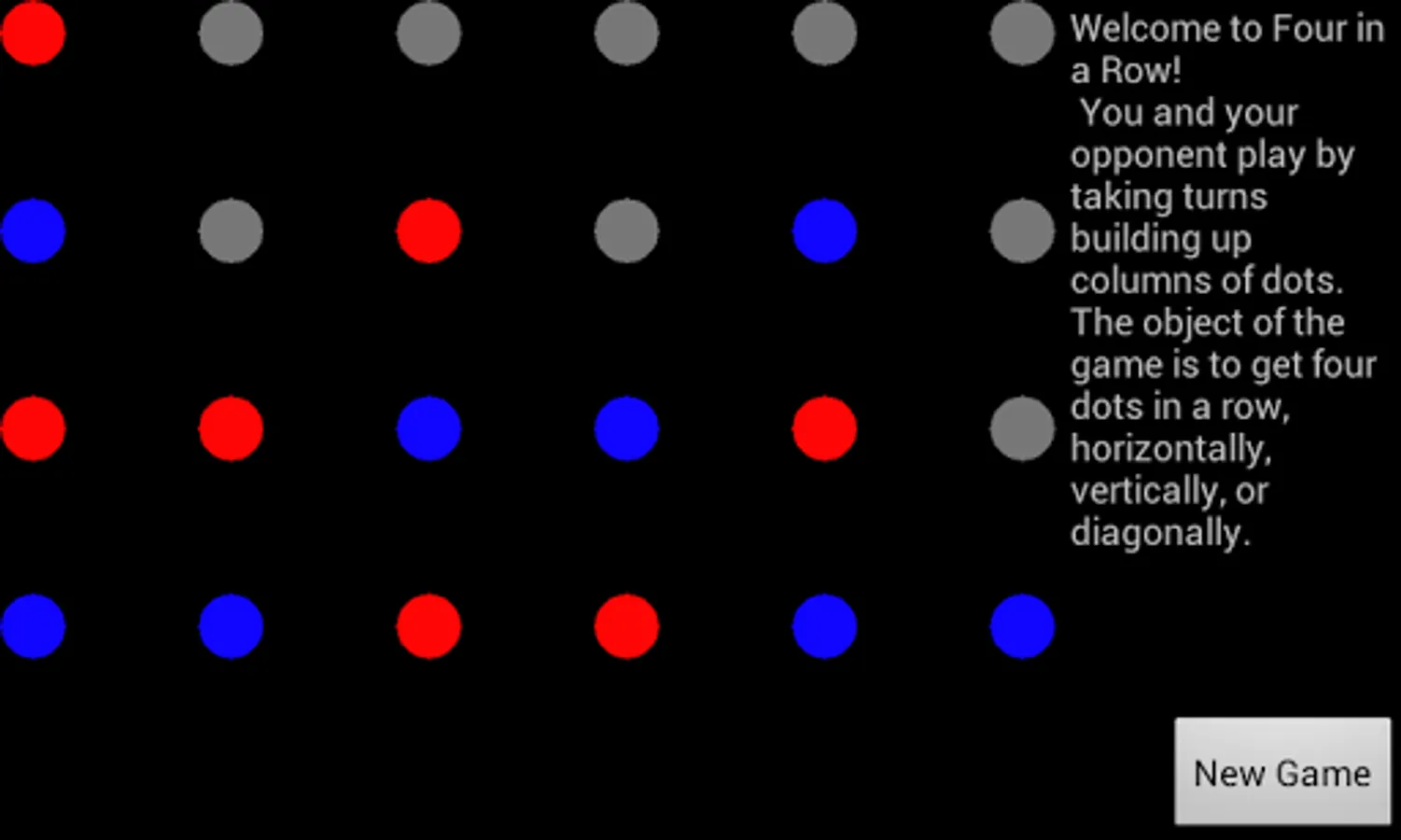The classic two-player game of Four in a Row! You and your opponent play by taking turns building up columns of dots. The object of the game is to get four dots in a row, horizontally, vertically, or diagonally.