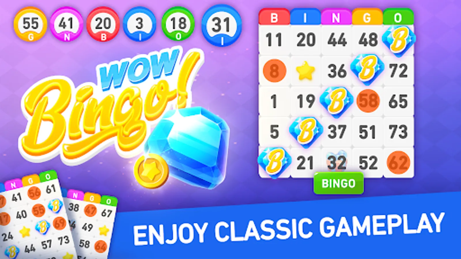 Bingo Wow requires constant internet connection and contains optional in-app purchases. This new bingo game is intended for an adult audience and does not offer real money gambling or any opportunity to win real money or prizes. Success within this bingo game does not imply future success with real money gambling.