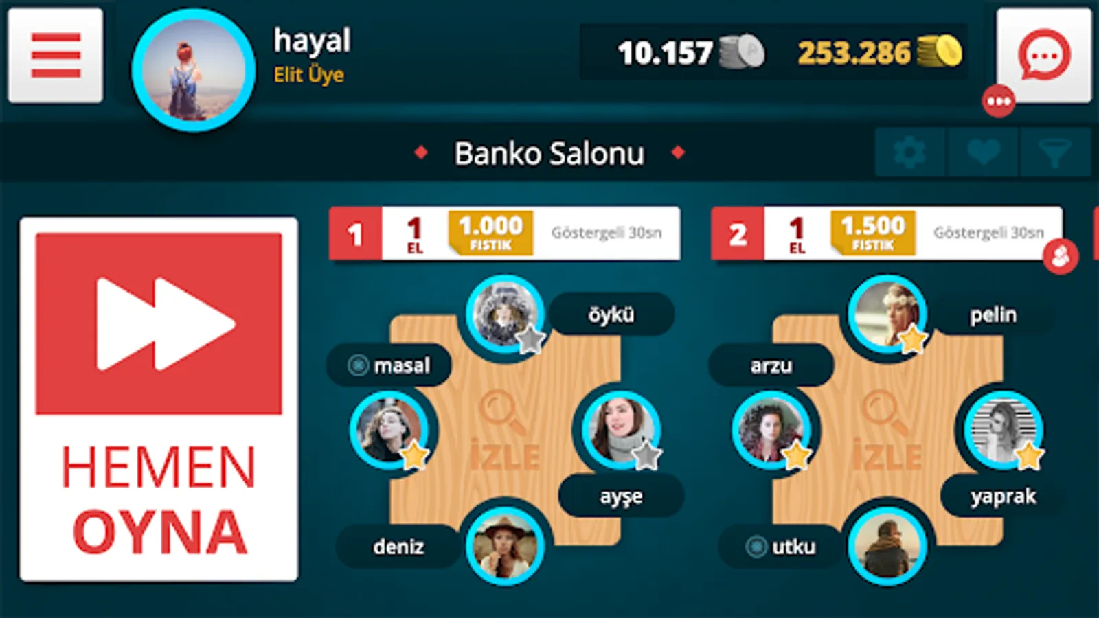 We have prepared Gamyun Okey, where you can play unlimited okey with FREE rated games, with years of experience, and we added VAT on top of it :) Does Okey have VAT? This game, which is also called banko in some regions, is much more enjoyable than okey. The goal is to minimize the sum of non-pairs, as opposed to face-to-face. The most important difference from okey is that you get the chance to win by changing the balances by ending up in pairs, even by throwing okey in the last hand.