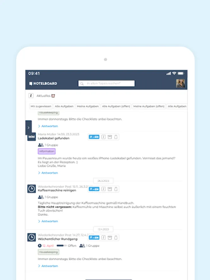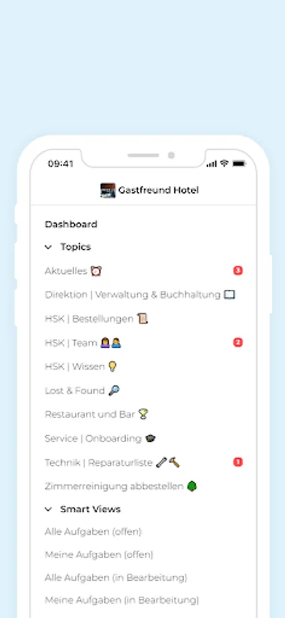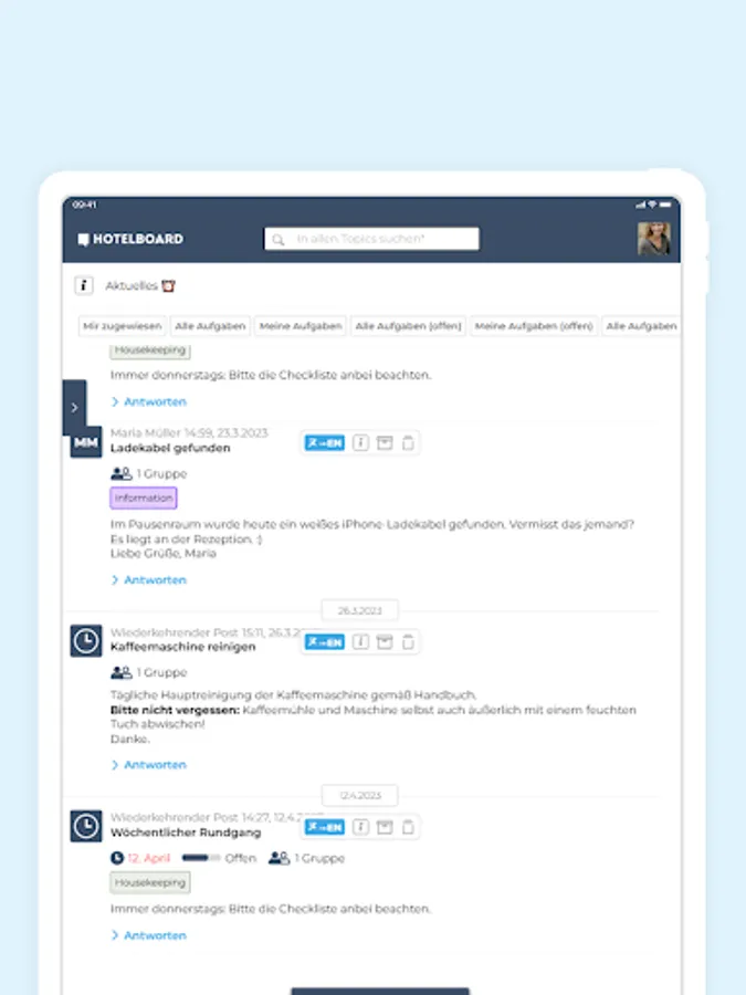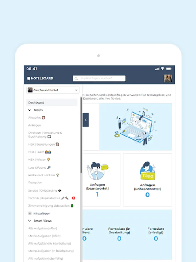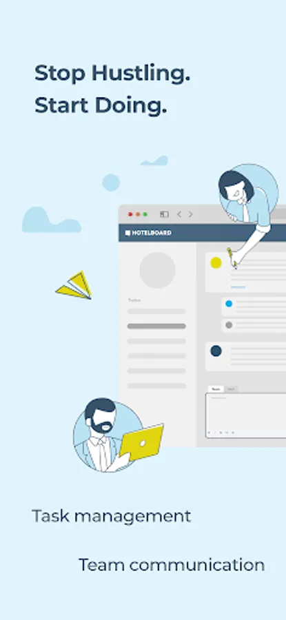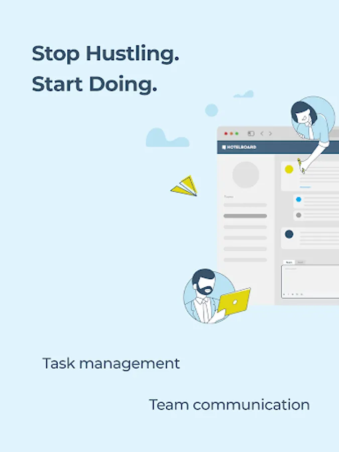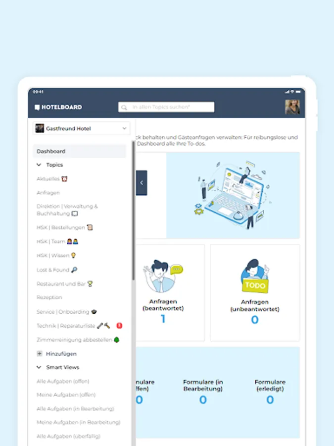 The Hotelboard app is the go-to tool for productive teams in the hotel industry: Following the motto “Stop Hustling. Start Doing!“, it allows you and your colleagues to meet in a digital environment, enabling smooth communication processes and task management.
