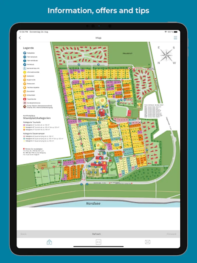 Find out about the catering offers on our campsite online and have a look at the site map. The app also provides information about the basic equipment of the holiday homes as well as waste disposal, electricity and water supply on the pitches.