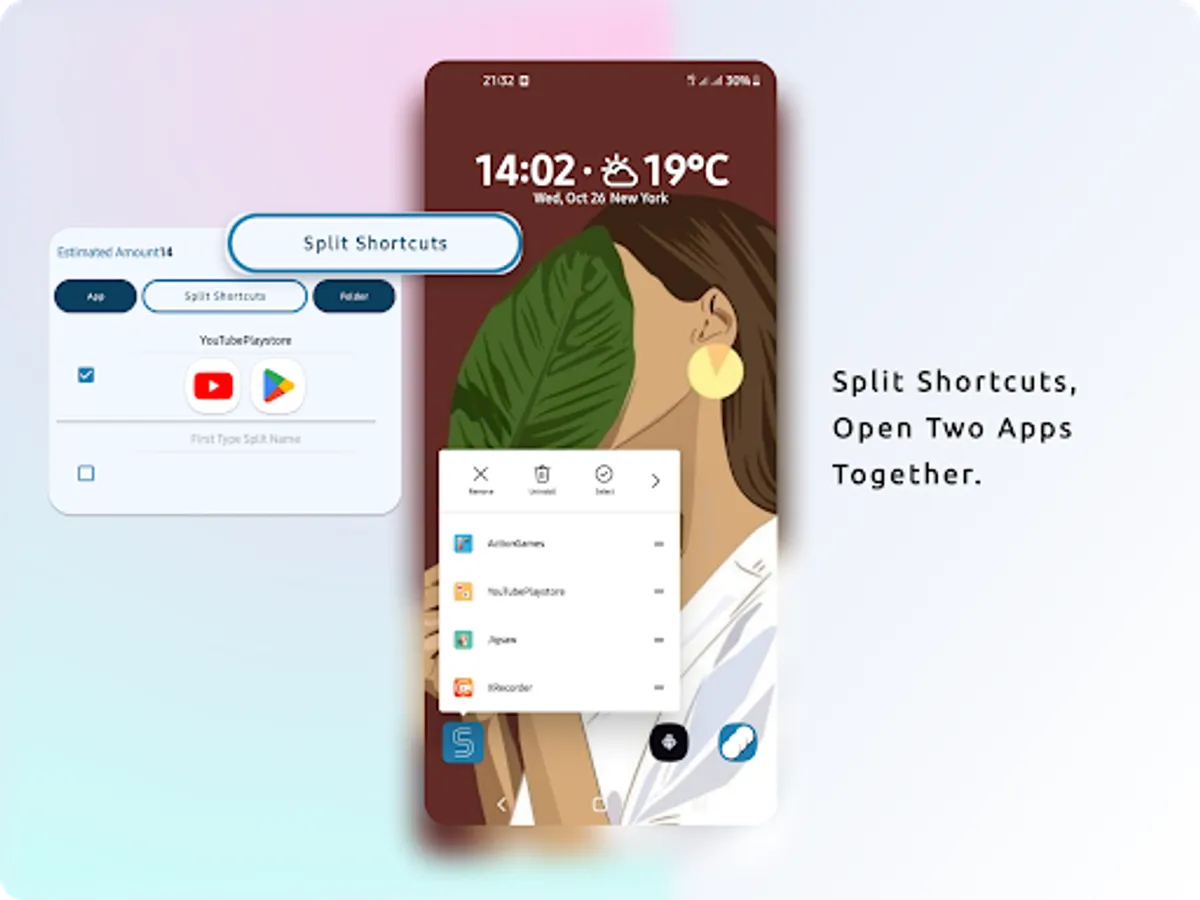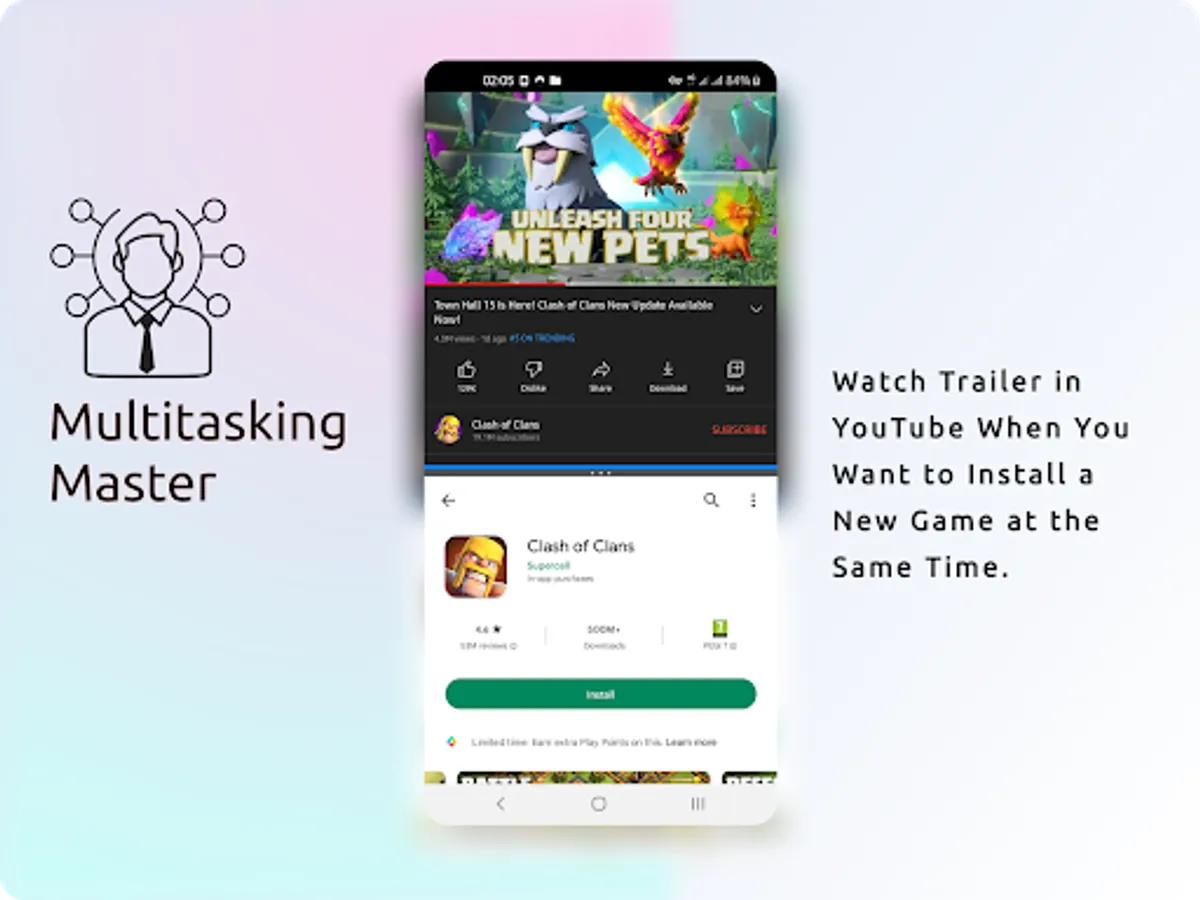 Super Split Shortcuts is a awesome feature to open two applications together. For example, it helps you to watch the trailer in the YouTube when you want to install a new game at the same time.