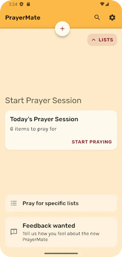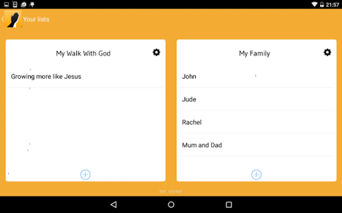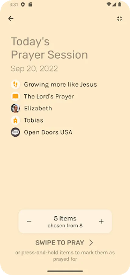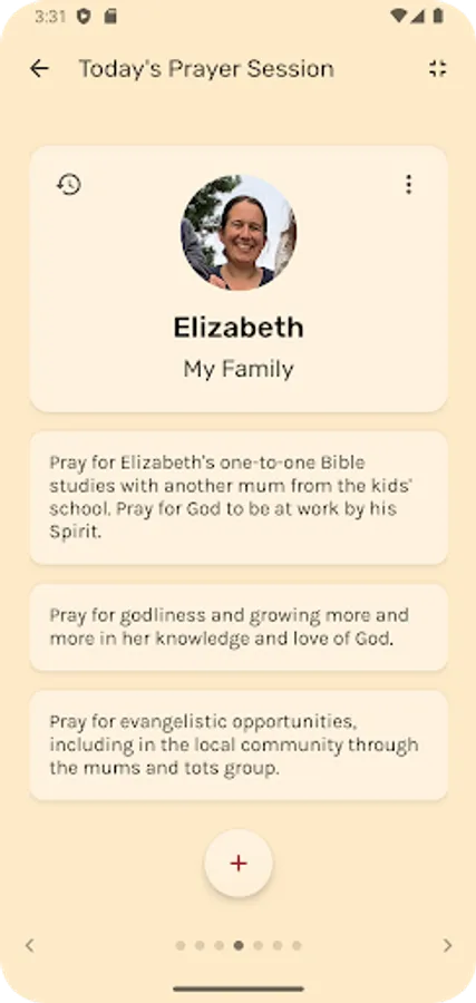 Every day, Prayer Mate will select a person or topic that you've entered from each of your main categories (perhaps "My family" or "My small group at church") and show them to you as a series of index cards - then just swipe between them to pray.