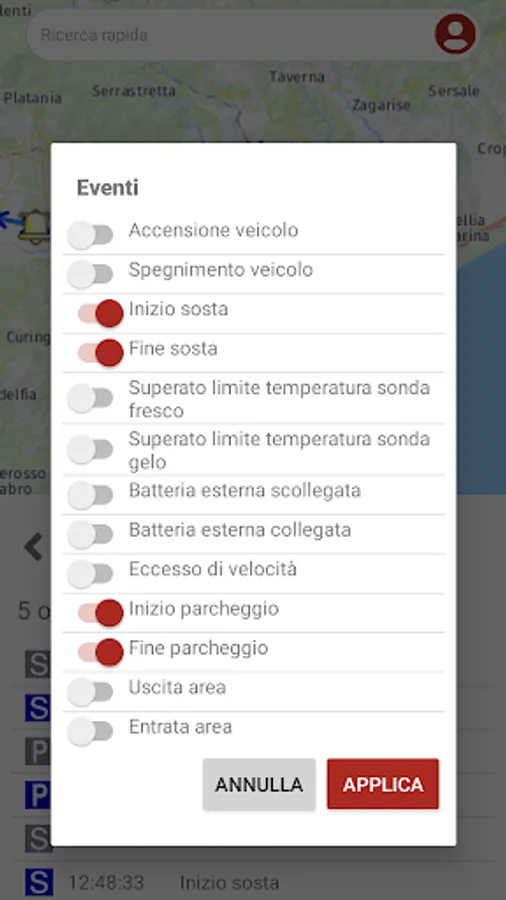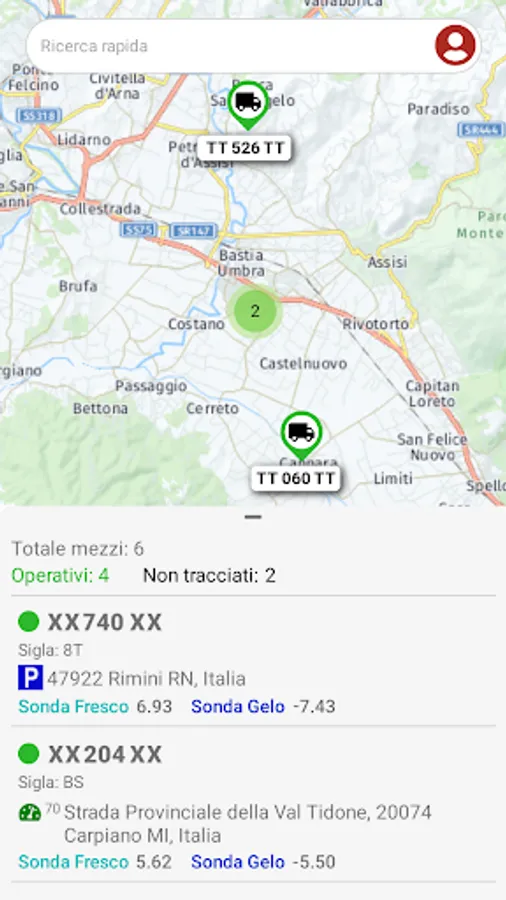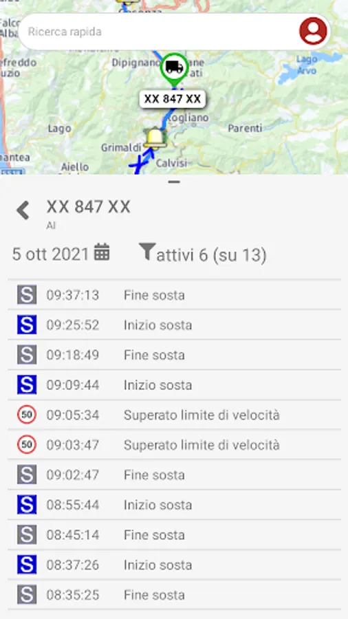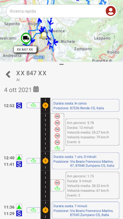 Quick search: Search filter to quickly locate the vehicle of your interest among the vehicles in your fleet, by typing part of the license plate or the current geo-localized address.