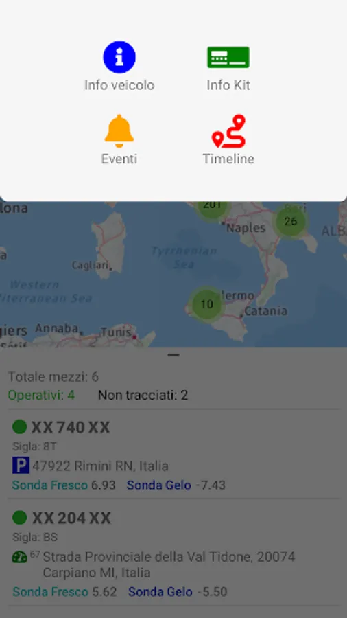 Vehicle List View: scroll through the list of your vehicles, in a summary list with the current geolocated address and, if available for your configuration, the temperature information detected in the refrigerated compartments of your vehicle by the temperature probes associated with your kit Roots on Wheels.