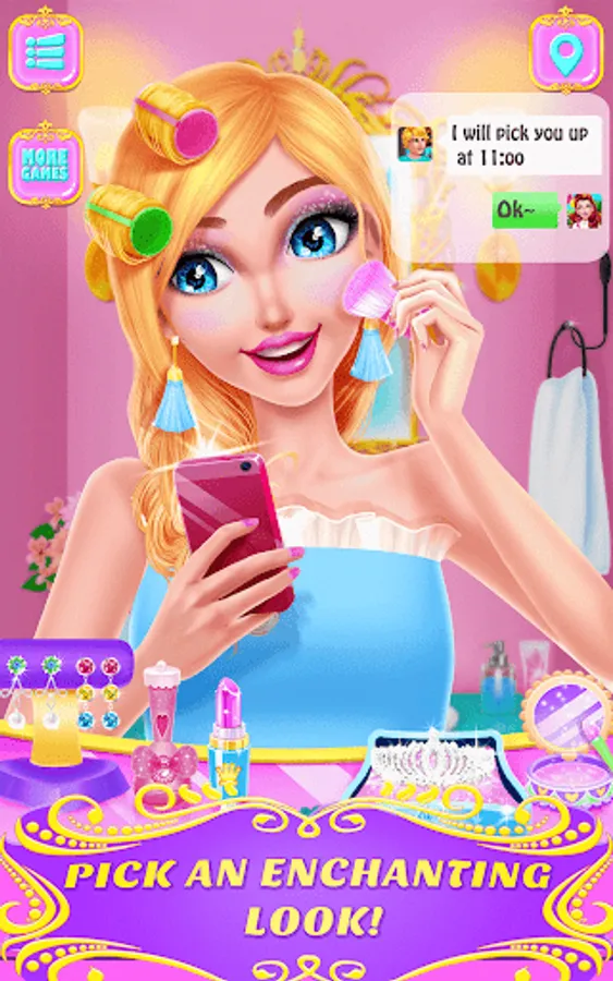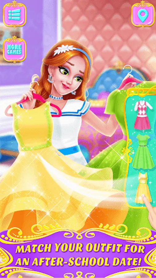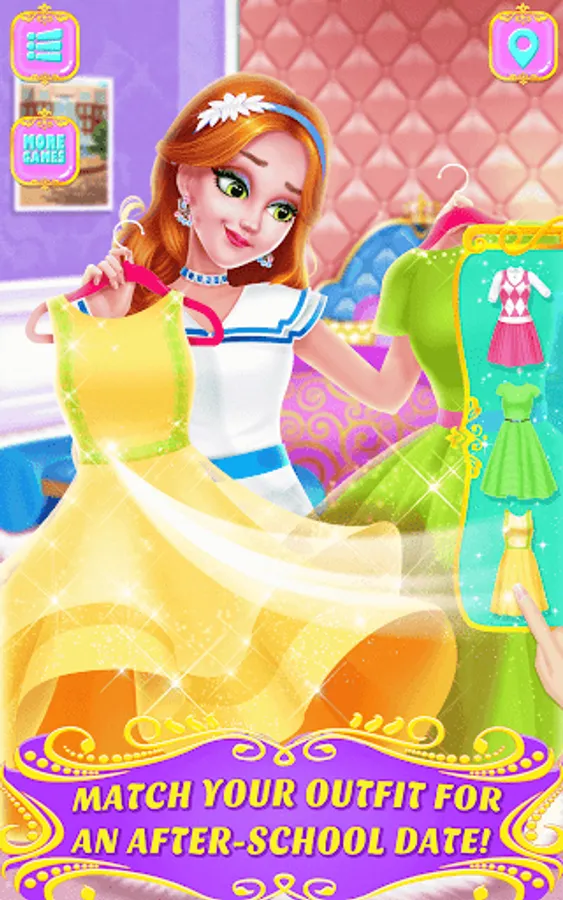 Then head to the royal closet to choose an outfit for a date with Prince Charming. Mix and match skirts and tops. Try on puffy ball gowns, skater style dresses and cute cocktail numbers. Add heels, stockings and other accessories. Don’t forget jewelry and a stunning crown. Head to school and find Prince Charming, then ask him out on a date! You’ll be the best couple in the whole school!