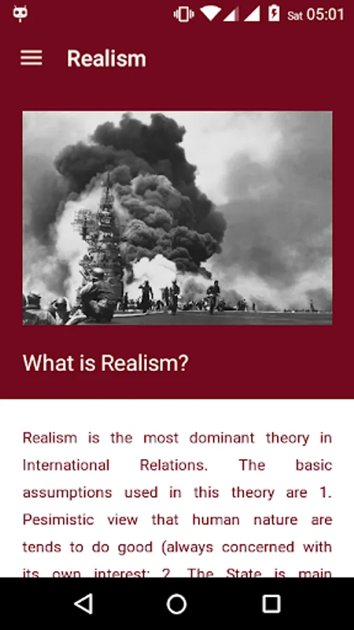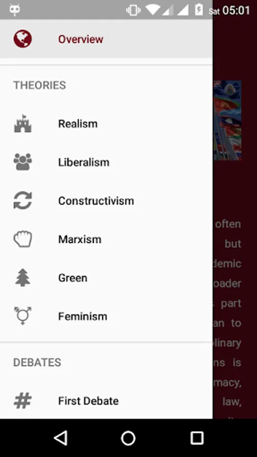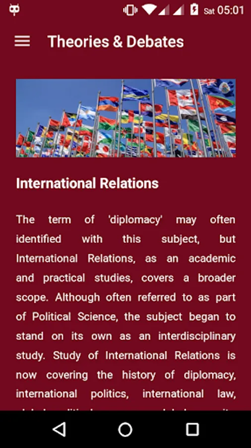 This app was developed to provide the essence of theories and major debates that ought to be studied by a scholar of International Relations. The interface is designed so that appear simple and elegant. Coverage of the material is also strived to keep it small but rich in information. In further development, this application will be equipped with features that will further assist users in understanding the materials available.