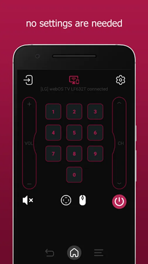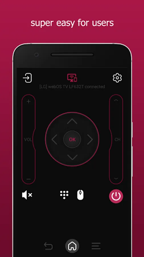 TV Remote control for LG is super easy for users as no settings are needed. It illustrates exactly the real remote onto your phone, which means all functions are available including from selecting channels, adjusting volumes to connecting youtube or even playing video games. Everything you need to get it accessible is that make sure you have TV turned on and the app opened on your phone. It is extremely simple and uncomplicated at all. This is truly an answer for the problems of the real remote disappeared when you need it or running out of battery. One app but solve many annoying troubles.