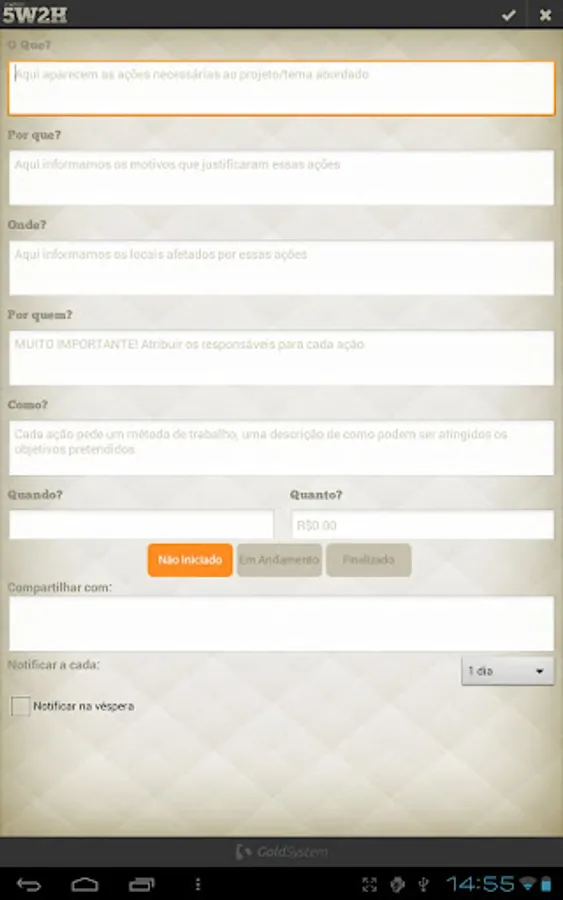 A tool developed by Gold ® System with a view to solving one of the main problems of the human being as the leader of your life: poor management of time and tasks. Focusing on this need, present a product based on a large method used for these purposes, which is 5W2H. In Brazil, it is also known as 4Q1POC.