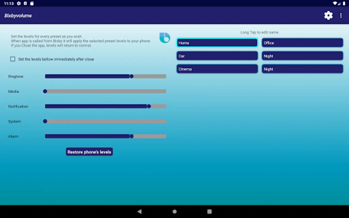 3. At current time, bixby will not restore levels to normal after routine ends. You may have to turn them back manually by opening the app and tap Restore phone's levels button.