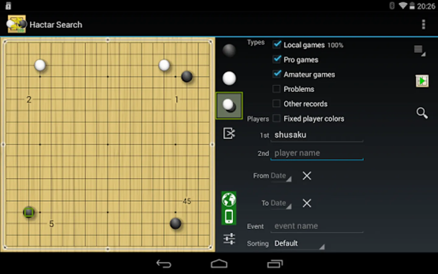 It is possible to search games for position or players. Search covers games from well-known public WEB archives, more that 90000 professional games are available. You can also include your games in the device to the search.