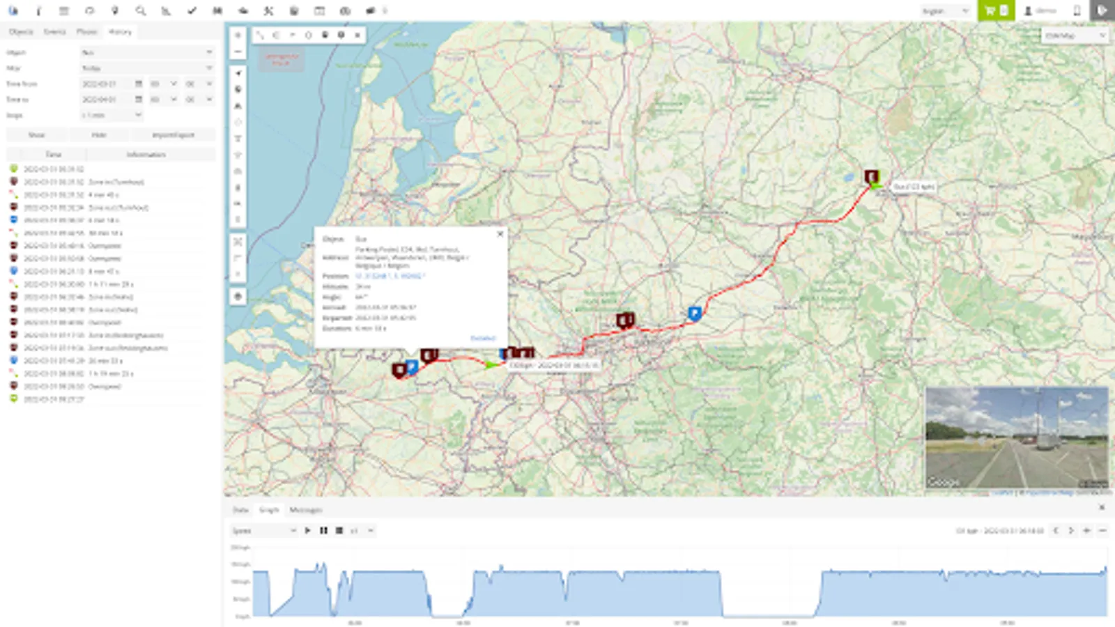 - History shows all stored data which server has collected from connected devices for chosen period of time. Software stores information received from GPS tracking devices, such as speed, time, location, stops, reports, events, etc. History is displayed in different ways: visually on the map, in a graph or HTML/XLS format.