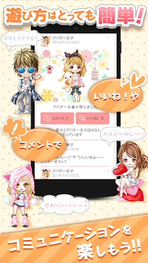 It is an avatar service where you can enjoy communication easily while doing "Like" or "Comment" on posts such as "Kode", "Hitori", "Abbapurisiru"