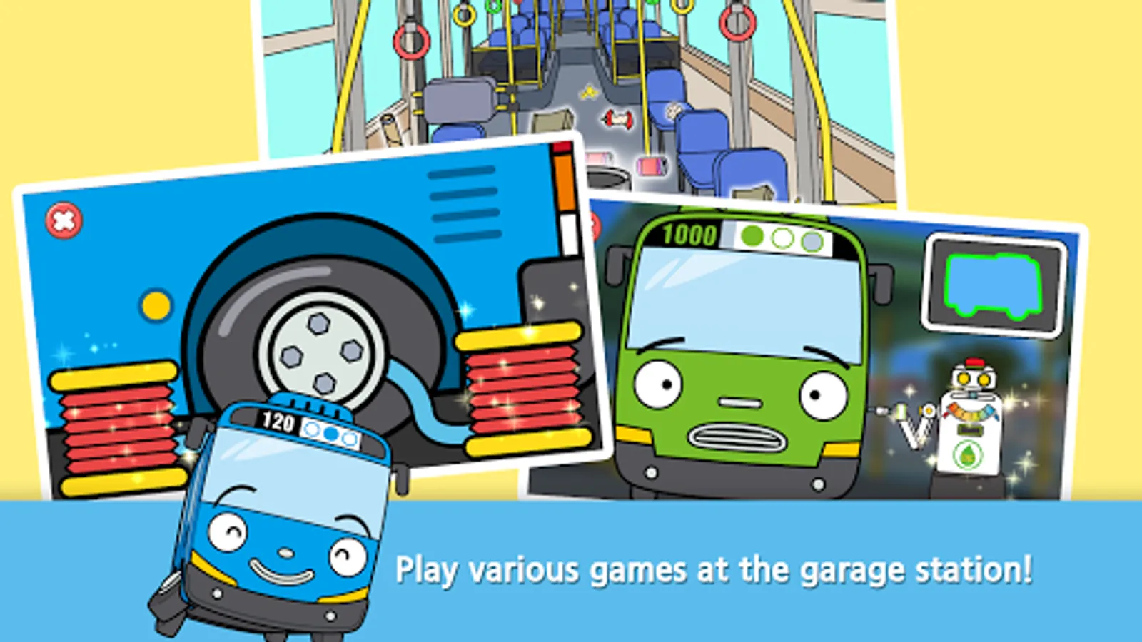 Tayo and his friends are waiting for you at the garage! Help our little bus friends to drive safely. From car washes to maintenance, try out a variety of games at the garage, and also collect cute stickers.