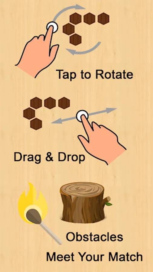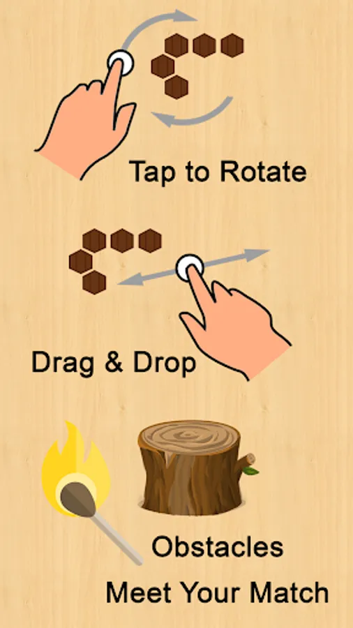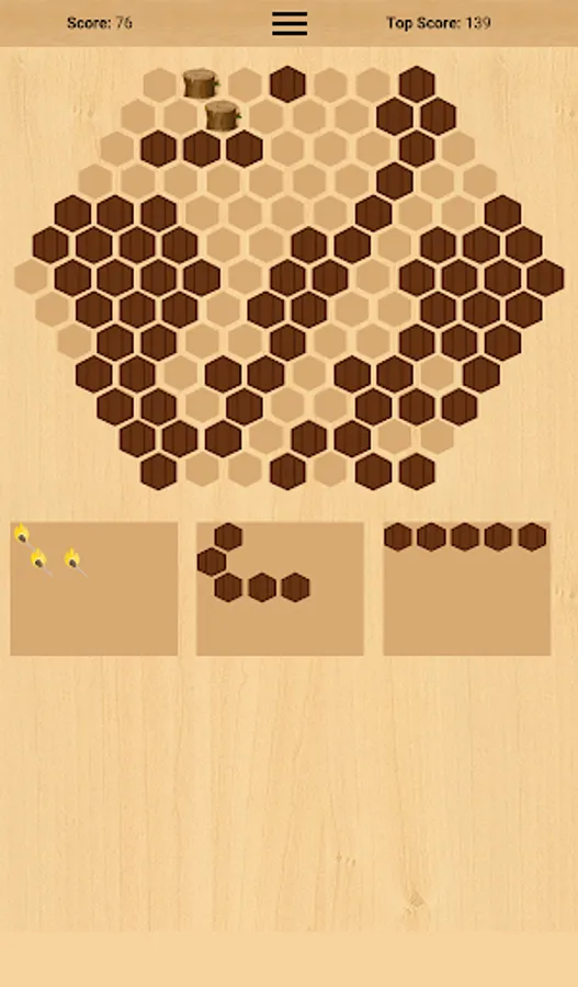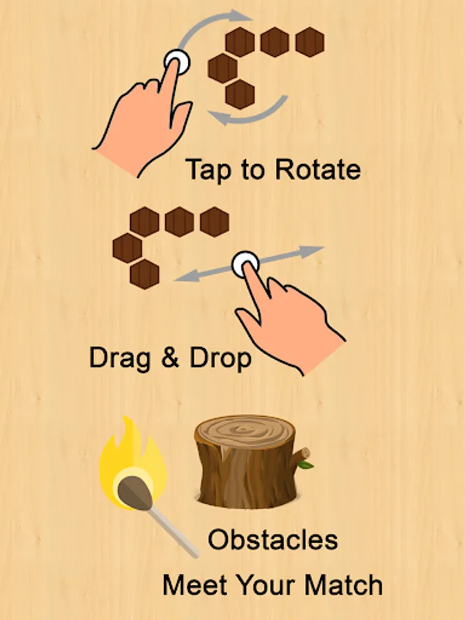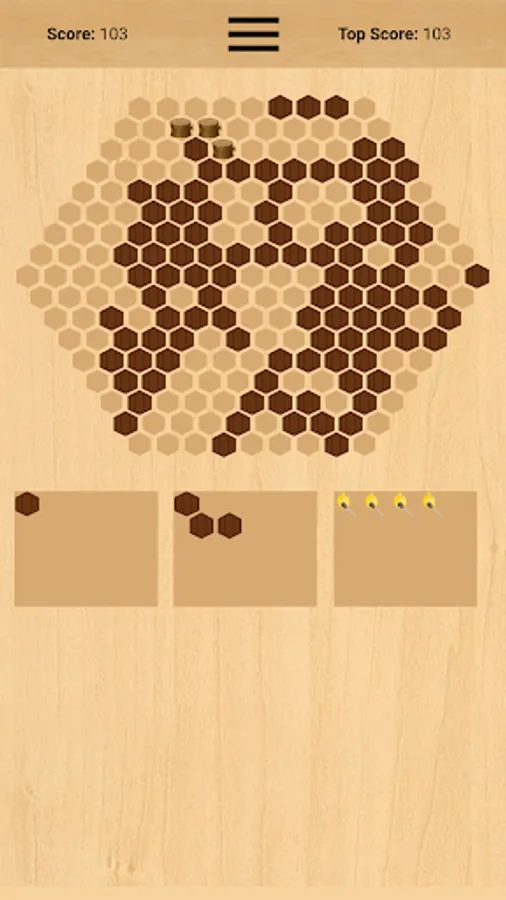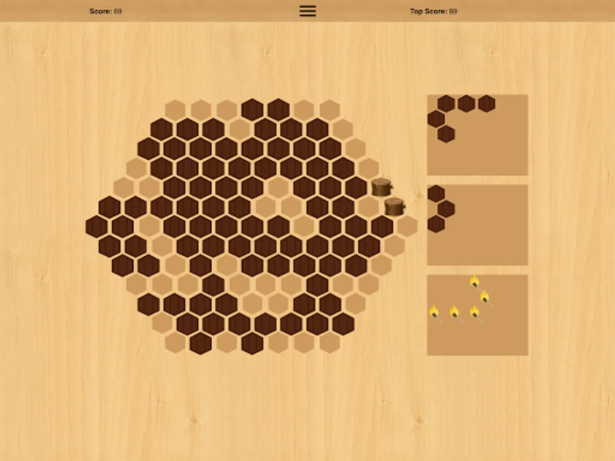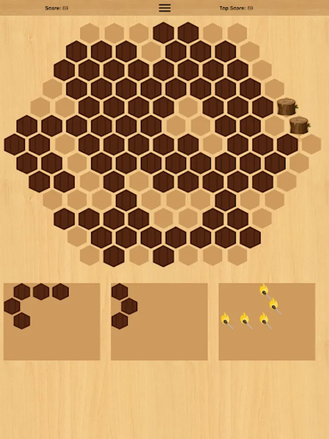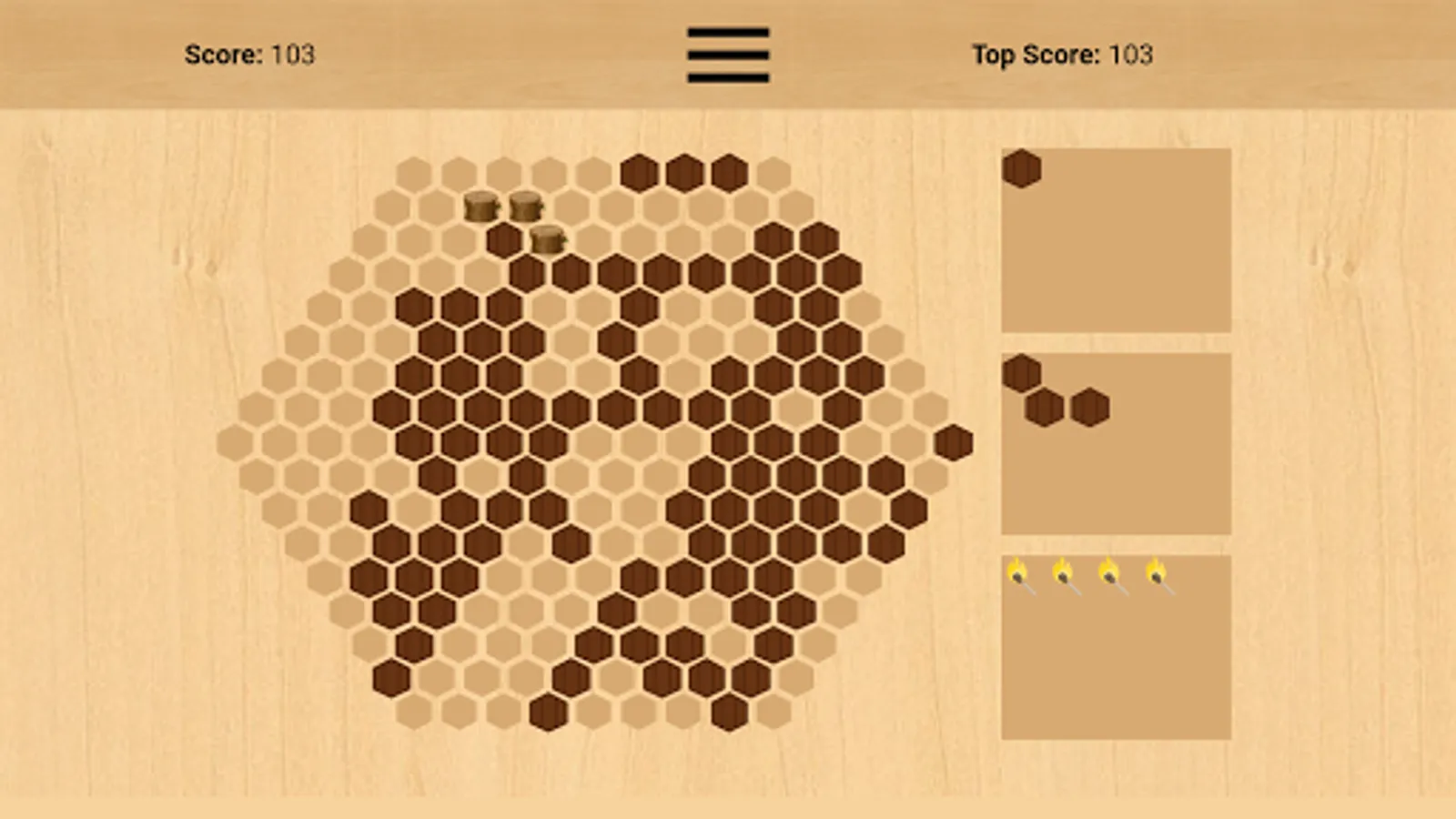 The game features a wooden board and tetromino like wooden hexagon pieces. The objective of the game is to form lines diagonally on the board using the hexagon pieces while avoiding obstacles.