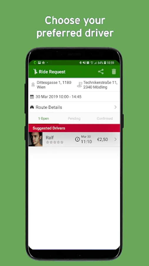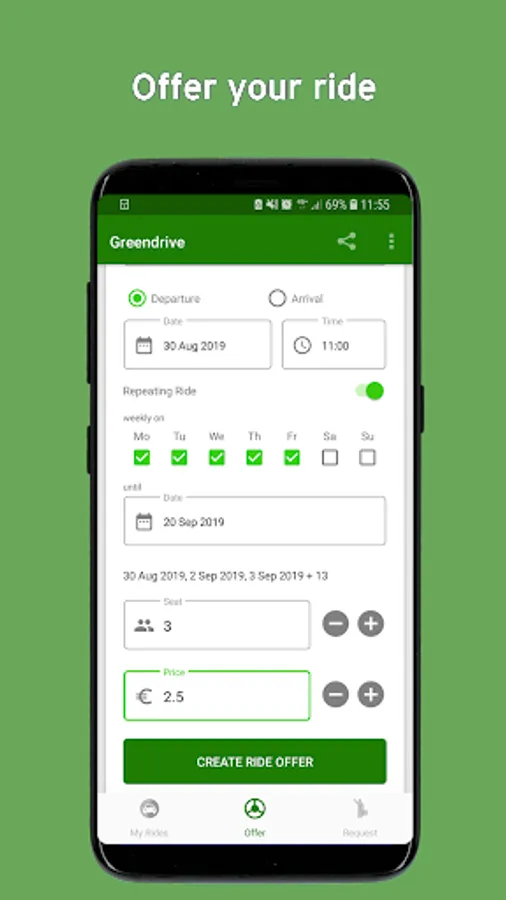 Using Greendrive is totally free and the service is perfectly suited for commuters: Enter your daily way to work once as a recurring schedule. Discover spontaneous rides home on demand just as easily.