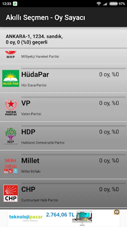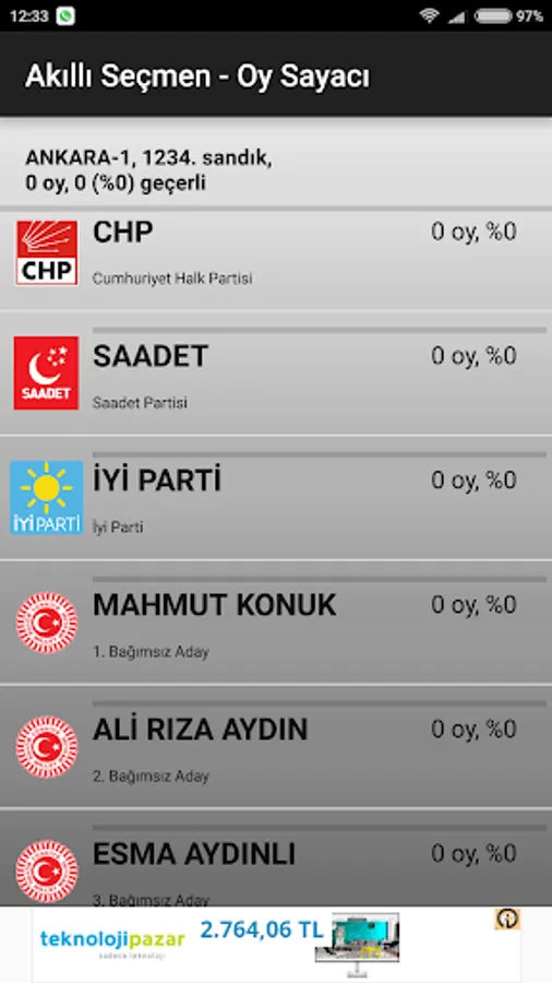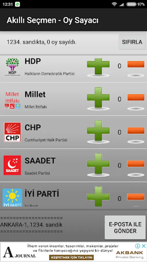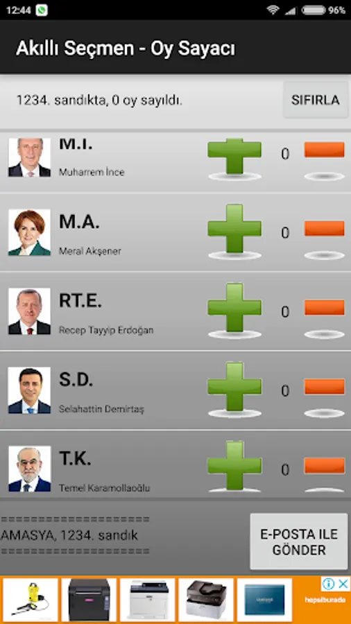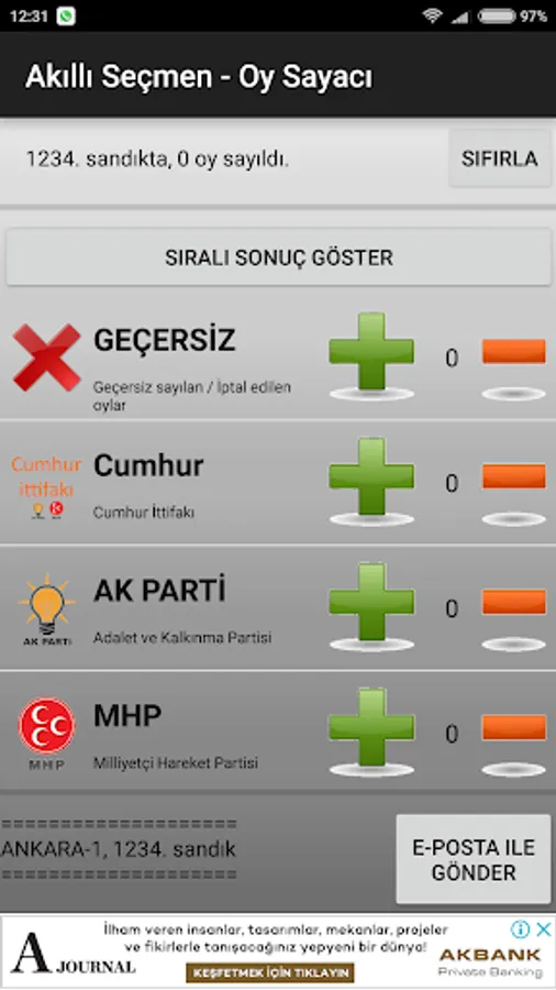 You can easily perform counting by increasing the number of votes for each option according to the valid / invalid votes from the ballot box. If you have incorrect entries, you can reduce the number of votes. You can also see the total number of votes used and compare it with the number of voters who voted in that polls. You can e-mail the results to the intelligent voter system and to the person you want.