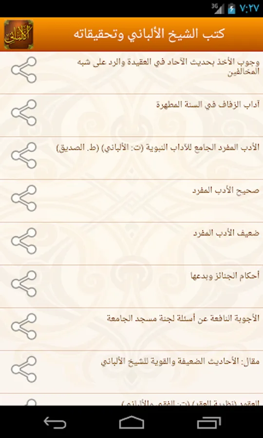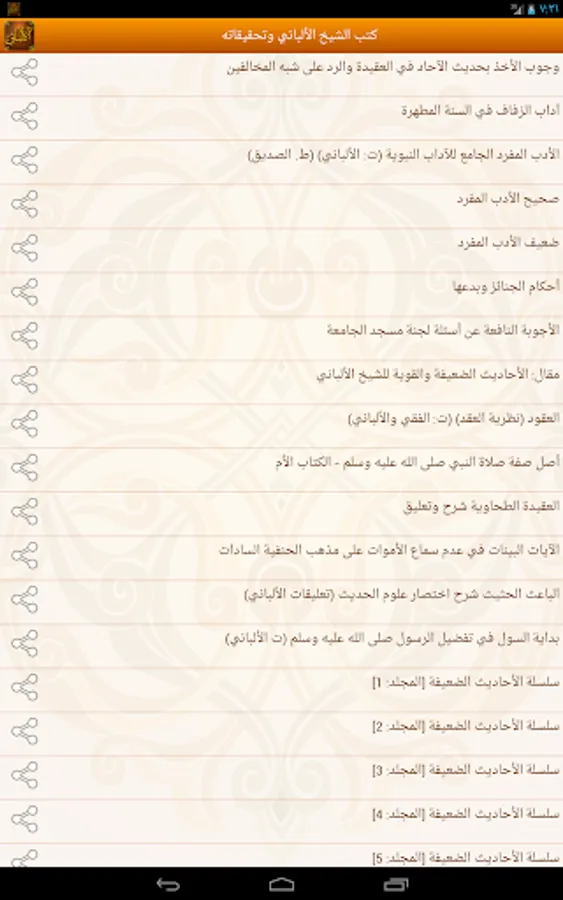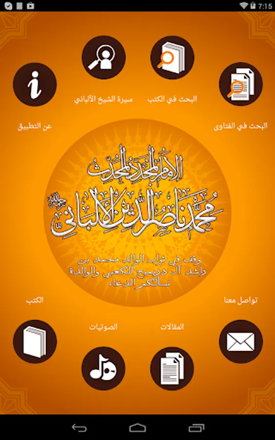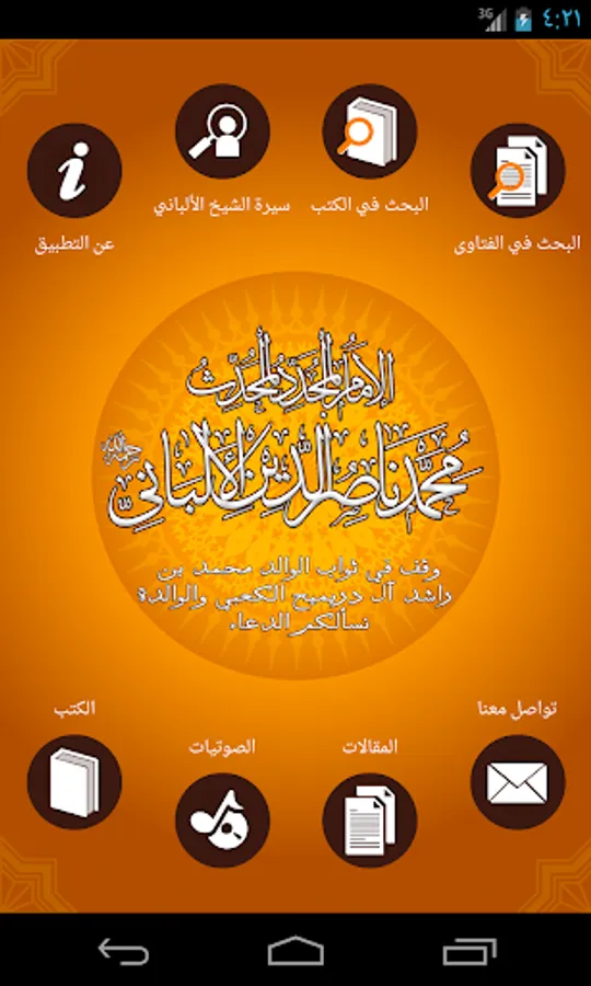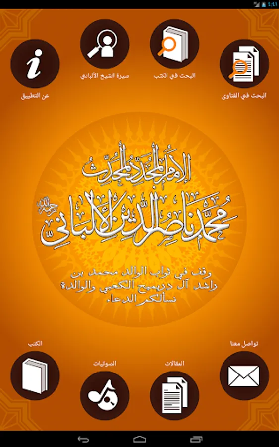 نضع بين يديك في هذا التطبيق ما تيسَّر من الكتب والتسجيلات والمقالات للعلامة المحدث والإمام المجدد محمد ناصر الدين الألباني. يمكنك أيضا البحث في جميع كتب وفتاوى الشيخ وتسجيلاته المفرغة ونسخ ومشاركة النتائج وجميع المواد المقروءة والمسموعة على الشبكات الاجتماعية أو البريد الإلكتروني وغيره. يحتوي التطبيق على الكثير من الكتب ومنها السلسلة الصحيحة والسلسلة الضعيفة وسلسلة تسجيلات الهدى والنور وفتاوى جدة ورابغ، وغيرها.
