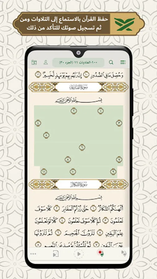 - تشغيل متواصل لصفحات كاملة وسور وأرباع وأجزاء والقرآن كاملا