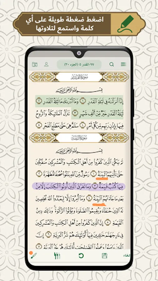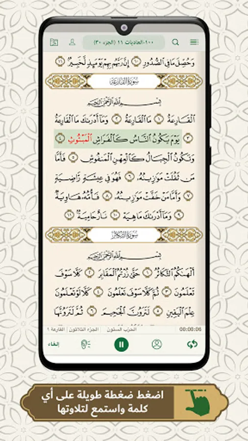 - إمكانية الضغط على أي كلمة وسماع تلاوتها بشكل منفصل