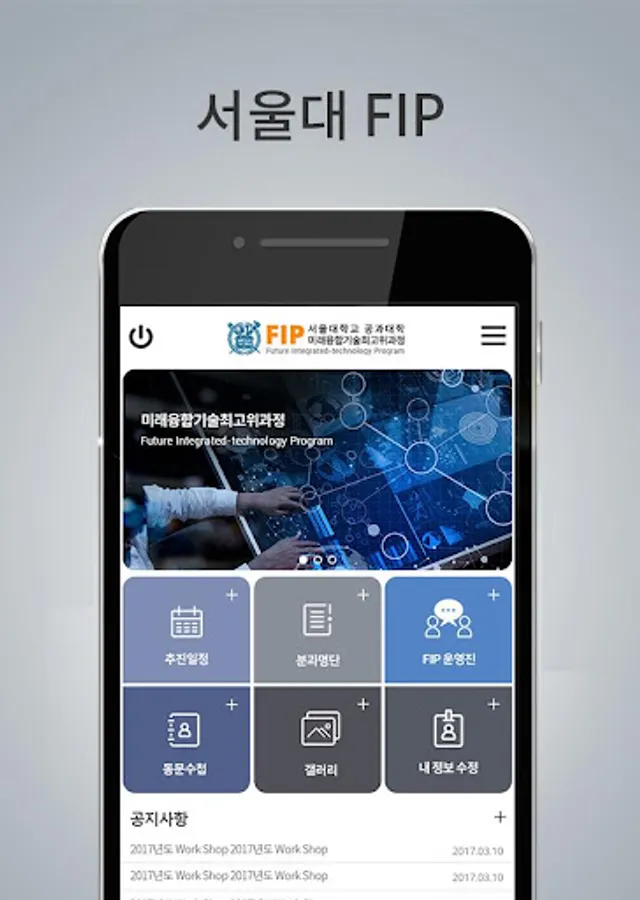 서울대학교 미래융합기술최고위과정(FIP) 소식과 동문 연락처를 열람할 수 있는 모바일 수첩 어플리케이션입니다.