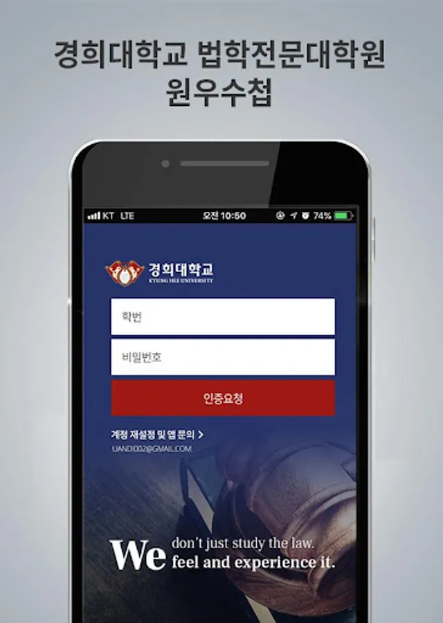 Only alumni and professors of Kyunghee University's Law School are available, and all data used in the Mobile Handbook are managed directly by the Kyunghee University Law School Student Council.