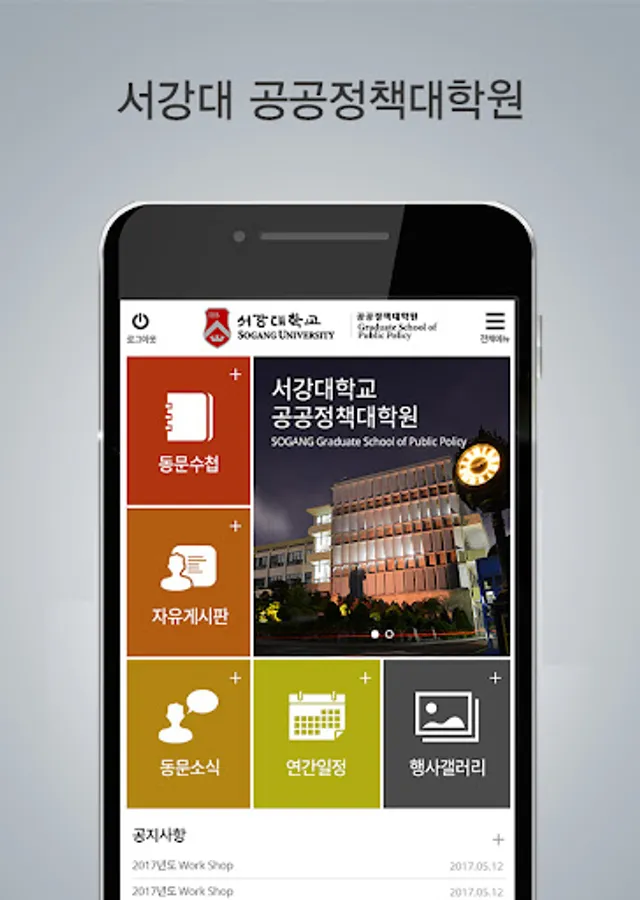 Sogang University Graduate School of Public Policy Alumni Association Available only to alumni, professors, and faculty members, and all data used in the mobile notebook are directly managed by the Sogang University Graduate School of Public Policy Alumni Association.