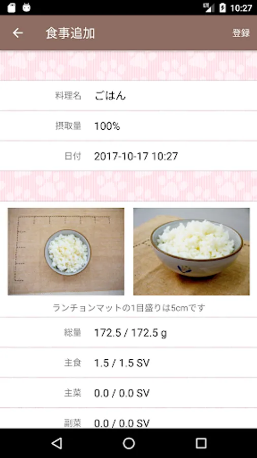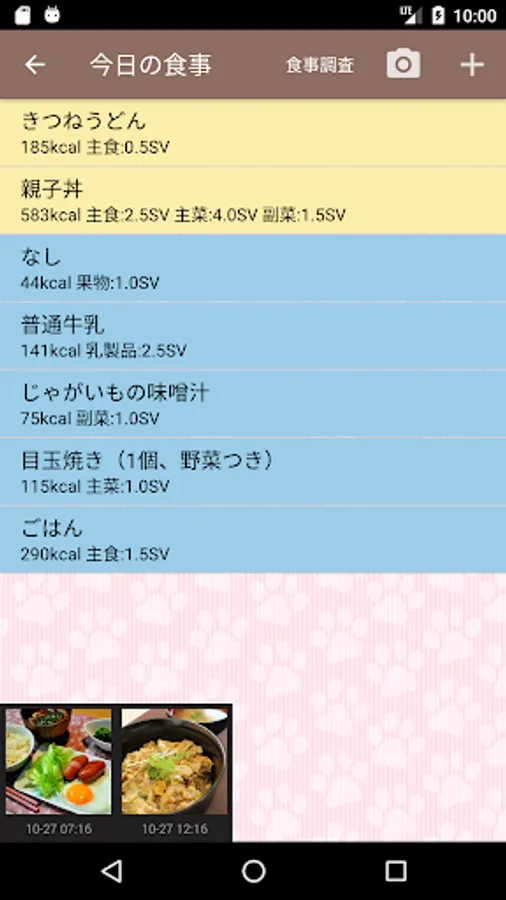 , Registration, editing and deletion of meals eaten. You can register by selecting from the diet list of 594 types.