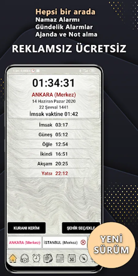 - Possibility to add and delete as many cities as desired. Travel, etc. In cases, you can set all prayer times and alarms according to the city clicked with a single click on the city name on the main screen.
