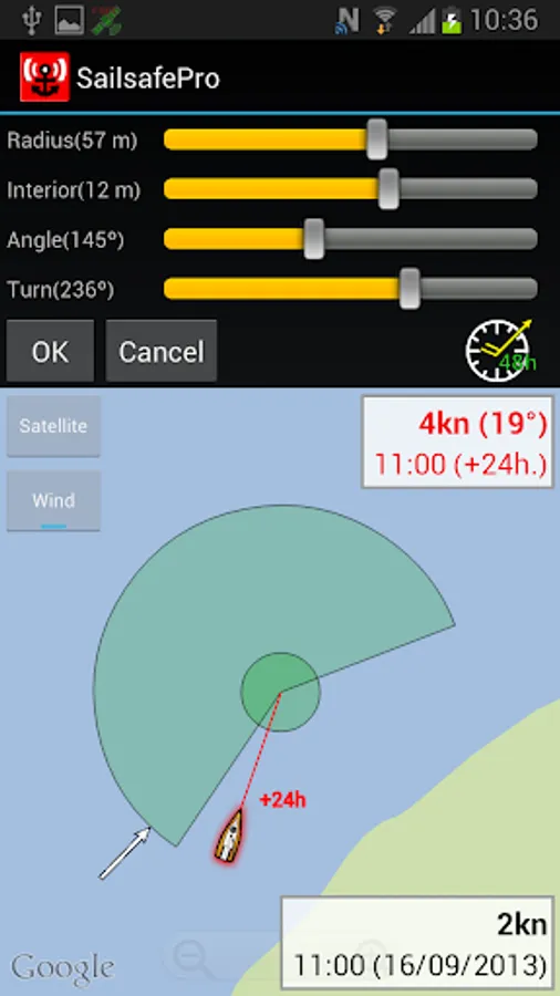 In PRO version, you can also specify an aditional exclusion zone to detect, for example, changes in wind direction that could put our boat at risk if, for example, the coast is positioned itself to leeward.