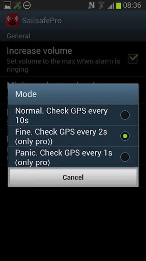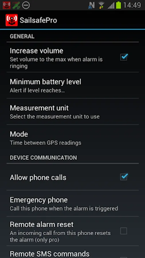IMPORTANT: Recent Android versions may stop the alarm when the device is idle (screen off) to save battery. To avoid this, go to battery settings and, at the end, add Sailsafe to the unmonitored apps list (this option might change depending on the Android version). Also check that you are not using any battery saving mode in your device.