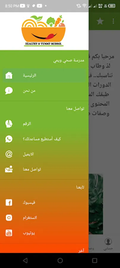 مرحبًا بك في تطبيقنا…..هنا ستجد ما لذ وطاب من الوصفات والحمية الغذائية التي تناسبك.. في مدرستنا الالكترونية ستتعرف على الدورات التي تناسب حميتك وتستطيع ان تعد طبقك المفضل بكل سهولة…..نسعى أن نقدم المحتوى بكل بساطة ويسر…هنا أيضا ستجد وصفات صحية متاحة للجميع ومعلومات في التغذية الصحية….