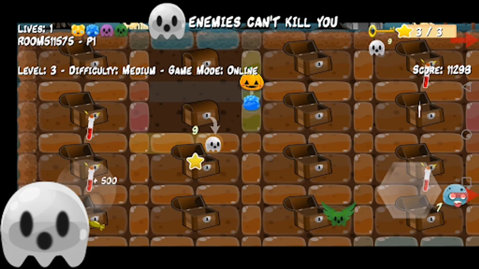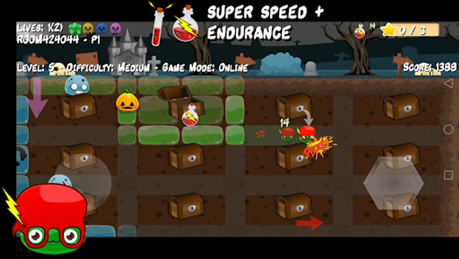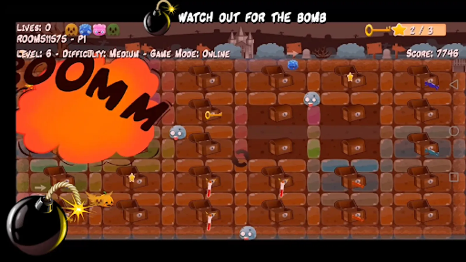Three game modes Survival (one life), Arcade (4 lives) and Online (online multiplayer game up to 4 players).