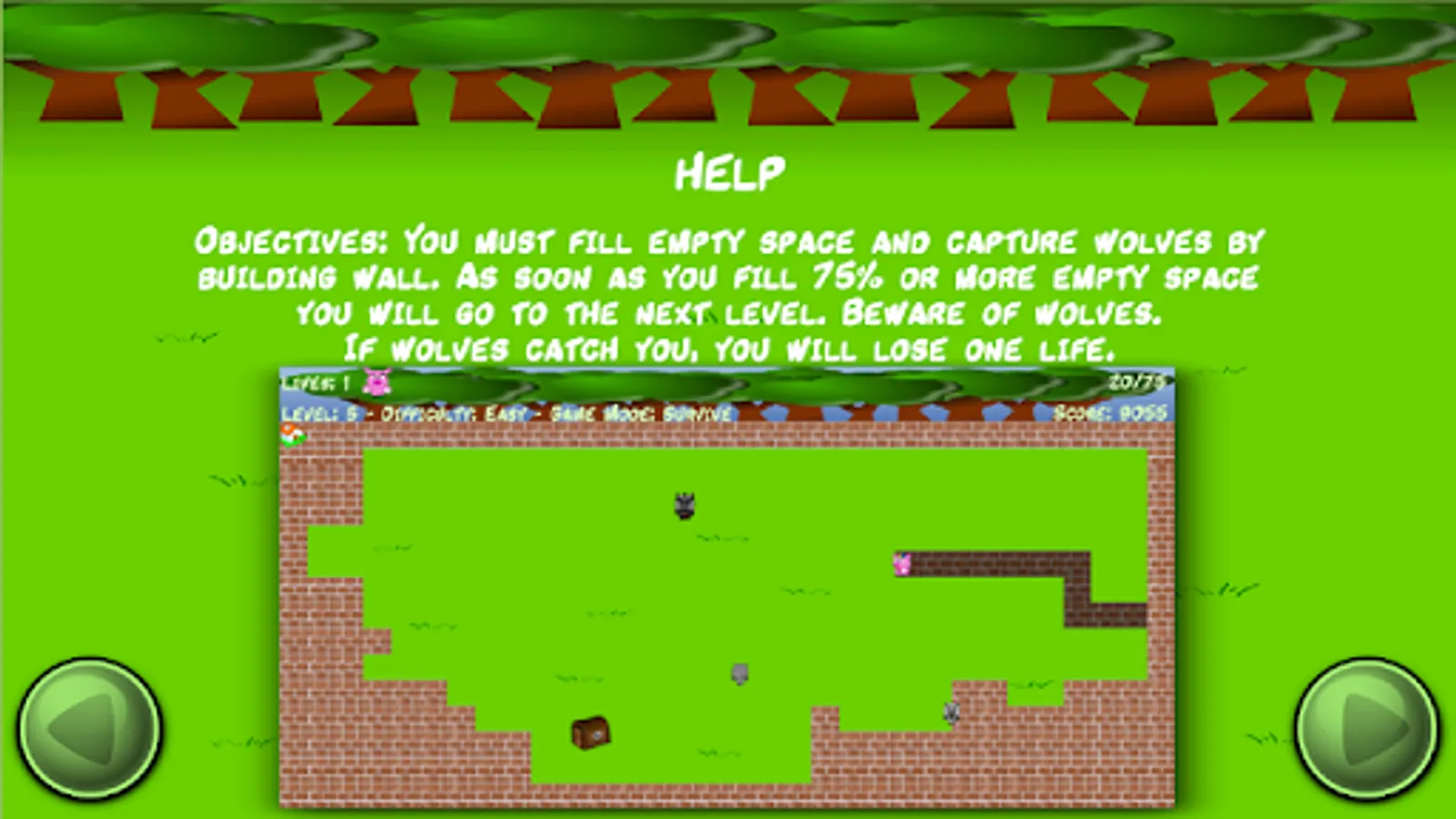 You must fill empty space and capture wolves by building wall. As soon as you fill 75% or more empty space you will go to the next level. Beware of wolves. If wolves catch you, you will lose one life.