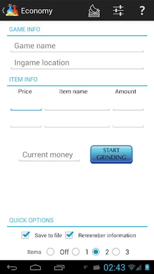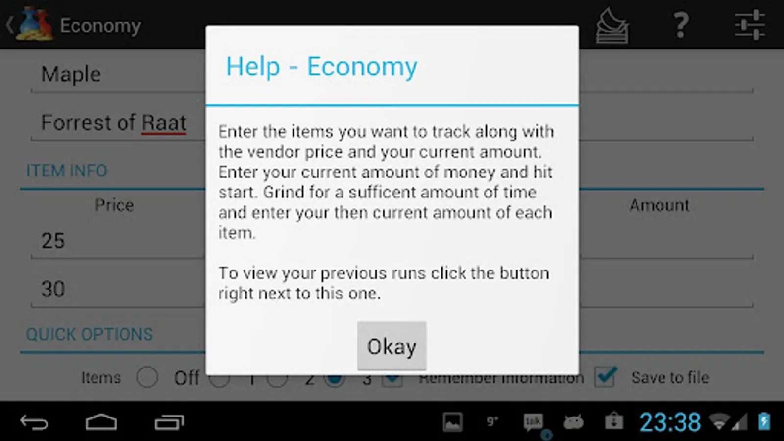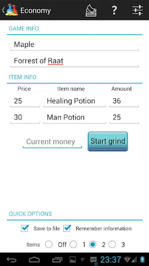Choose 0-3 items (potions, scrolls, mob drops) to track, assign them the vendor value and how many you got, enter your current cash and grind away! When you're done grinding you enter your current amount of items and cash and you'll learn your gross income per minute, including item usage and item drops!