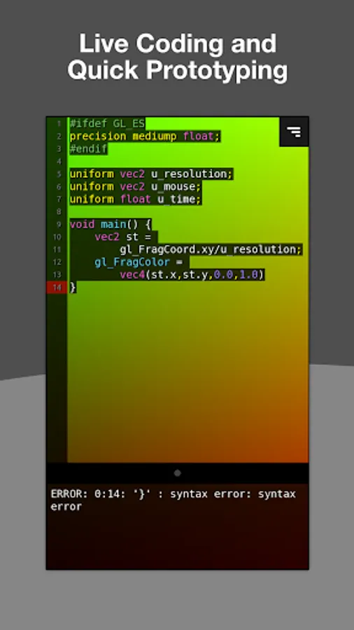 Code is checked, evaluated and updated in the background as you type! Quick prototyping of visual effects without having to wait for compilation.