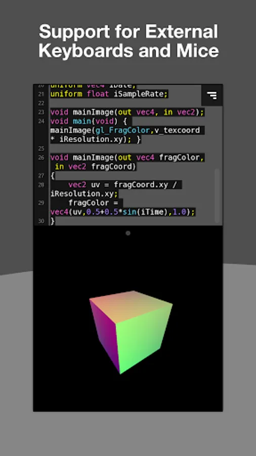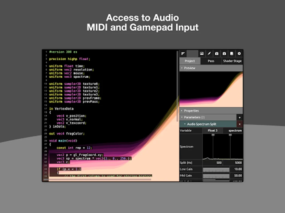Use your device's audio input and all available MIDI connections or connect a gamepad to drive your visuals. Support for external keyboards, mice and trackpads.