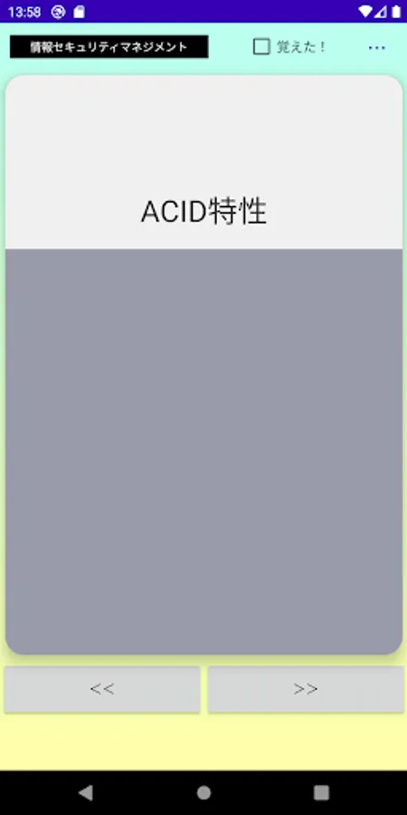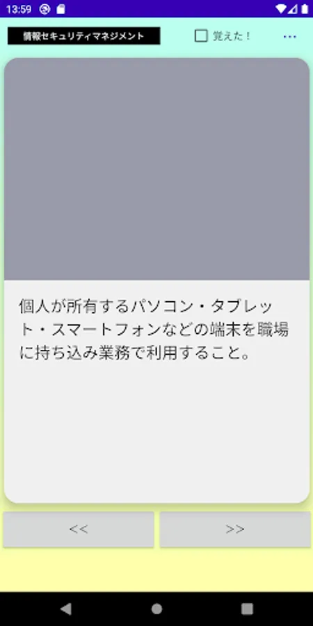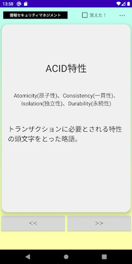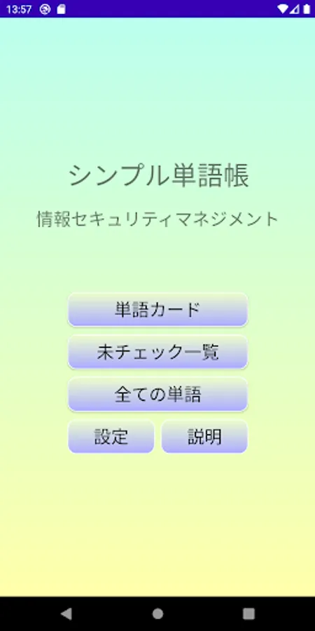 This app is a simple vocabulary app that was created to quickly learn such technical terms in a short time. Since it is not a quiz format such as 4 choices, you can proceed quickly without hesitation with unknown words. We hope that it will be useful as a companion to the Information Security Management Examination.