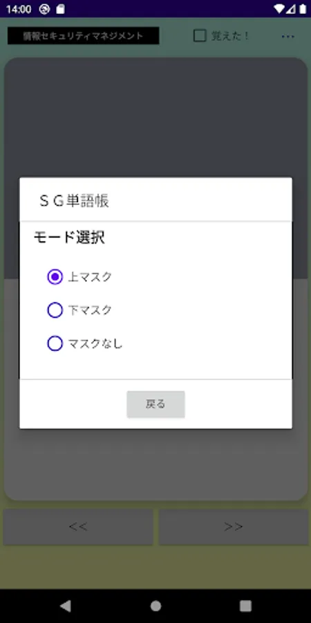 ★ You can select the mode to hide the meaning (lower mask mode), the mode to hide the word (upper mask mode), and the mode to hide both (no mask mode) by putting the word and meaning on one screen instead of the front and back. I am doing it.