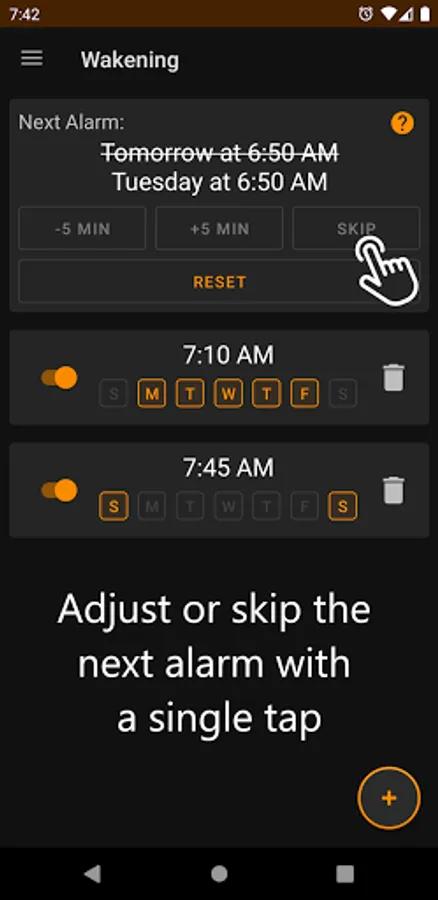 ● Offset or skip the next alarm: One tap to offset or skip the next alarm without resetting the recurring schedule