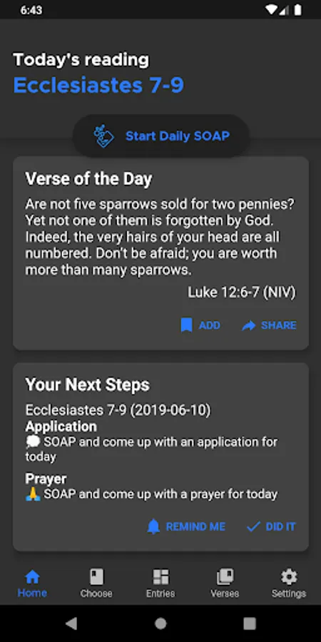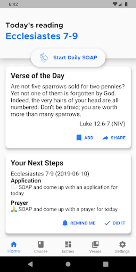 • Add verses from Scripture section, verse of the day, or manually input verses that you want to meditate and memorize