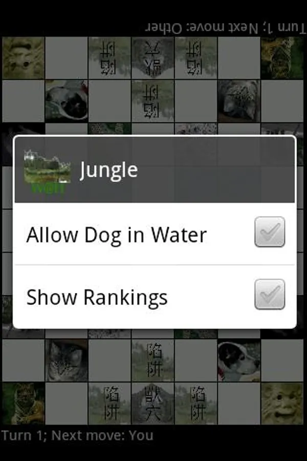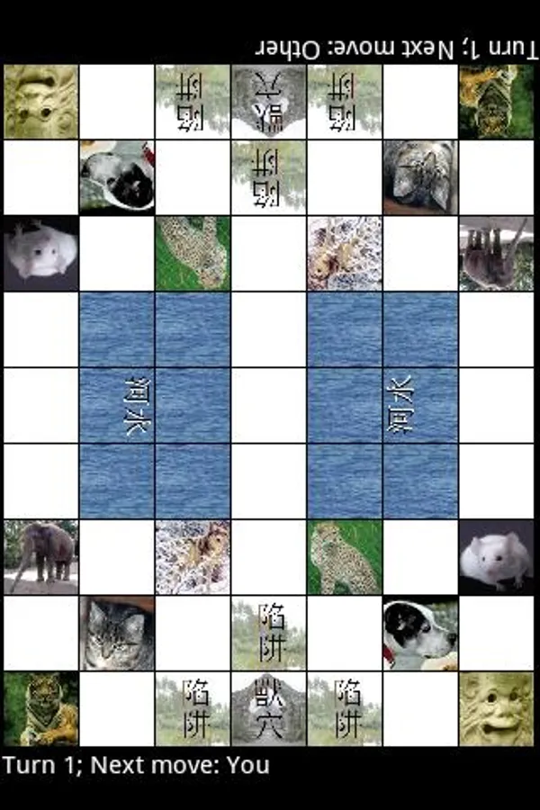 Normally only the Rat is allowed to enter the water. However you can select an option allowing the Dog to also enter the water. No piece can capture from water to land. However a piece in water can capture another (not higher ranked) piece if both are in the water. The Tiger and Lion can jump across the water from a square adjoining the water to the vertically or horizontally opposite adjoining square. However they cannot jump over another animal which is in the water.