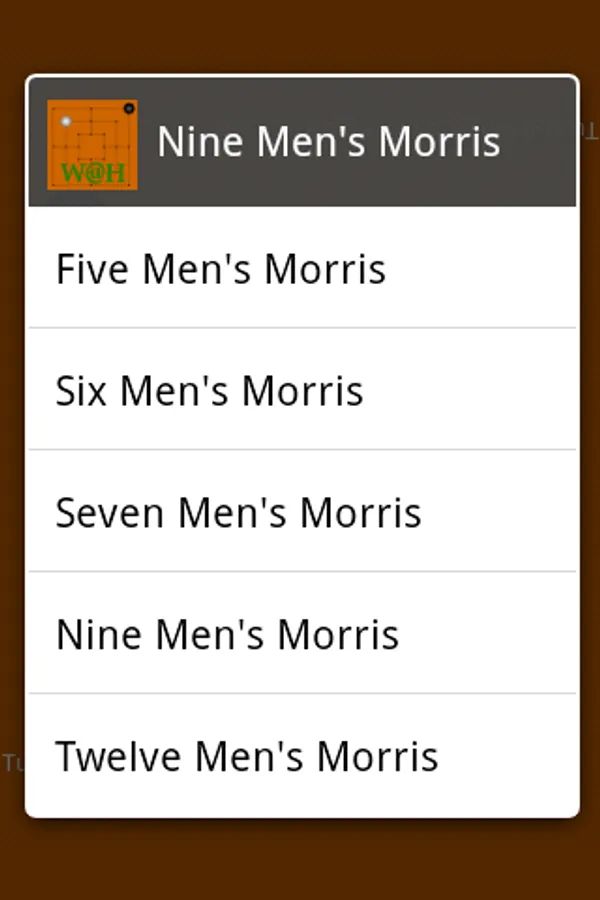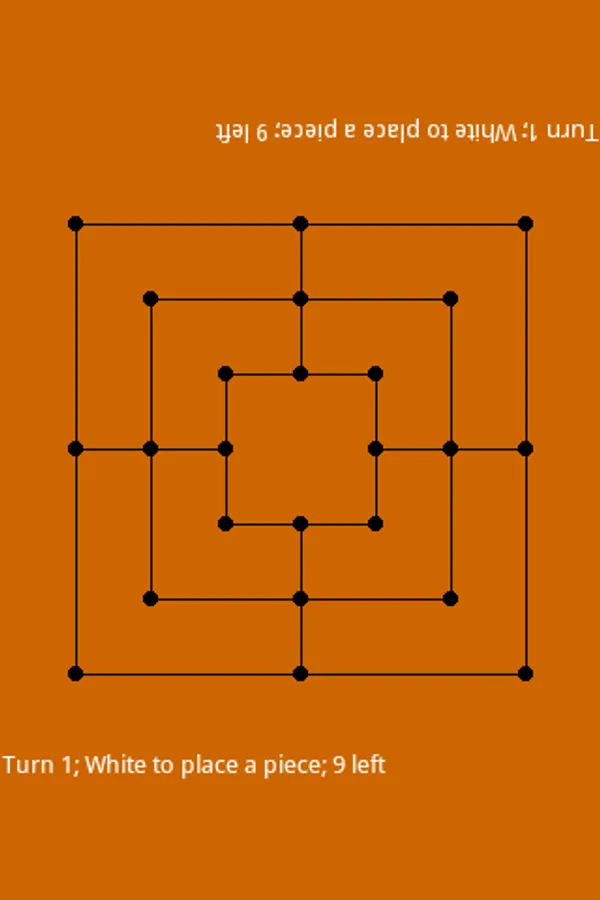 This app is designed for use by two humans playing against each other. It records your moves, checks for valid moves, and lets you know when someone has won. Otherwise it lets you get on with playing the game. You begin by placing the pieces on the board. White always starts and the players alternate. Whilst placing pieces the player whose turn it is taps the location where the piece is to be inserted. If a player forms a row of three (called a 'mill') along any of the lines marked on the board they are entitled to remove one of the opponents pieces. Pieces from a 'mill' can only be removed if there aren't any other pieces available. To remove a piece touch it. When all pieces have been placed on the board you can start to move them. A piece can be moved to a neighbouring empty location. Select a piece to move by touching it. It will then be displayed slightly larger than the other pieces. Select the destination and, if the move is allowed, the piece will be moved there. To deselect a piece without moving it just touch it again. The same rules for removing opponents pieces apply at this stage also. The game is over when one player has fewer than three pieces or cannot make a move.