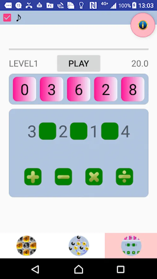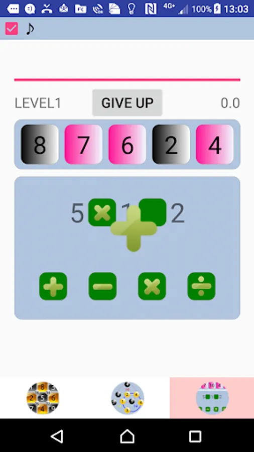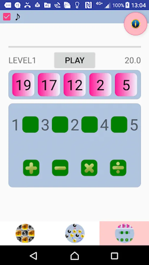 This is a math game in which the four arithmetic symbols (+-×÷) are applied to three numbers (maximum five) to create five designated numbers.