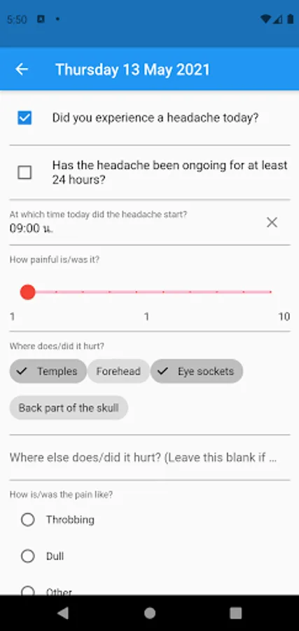 Headache Diary is an application used for keeping record of headaches. You need a registered account, which will be only provided to patients of Headache Clinic, Chulalongkorn Hospital, to be able to sync your data and store it on the cloud. You can also use the application without an account via guest mode.