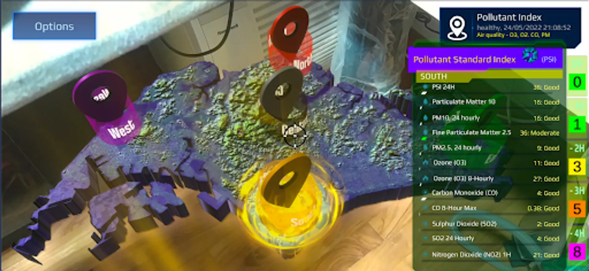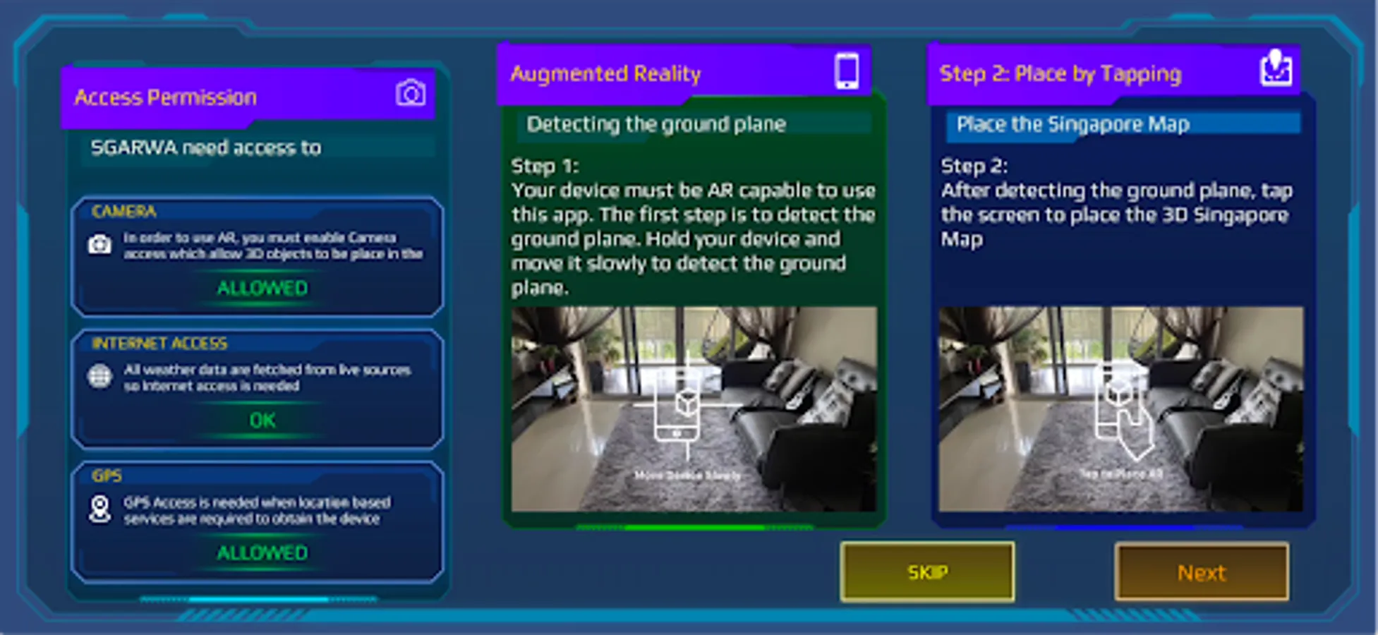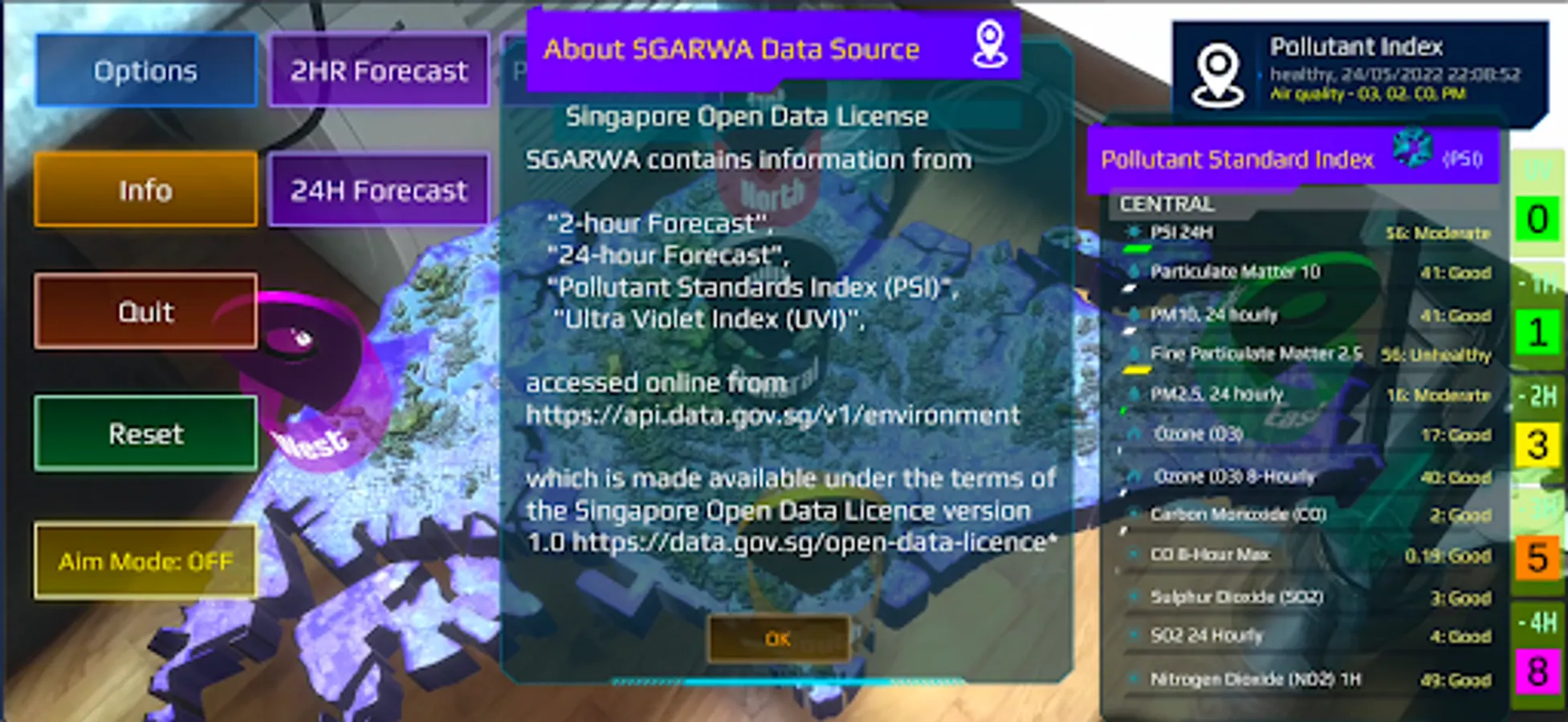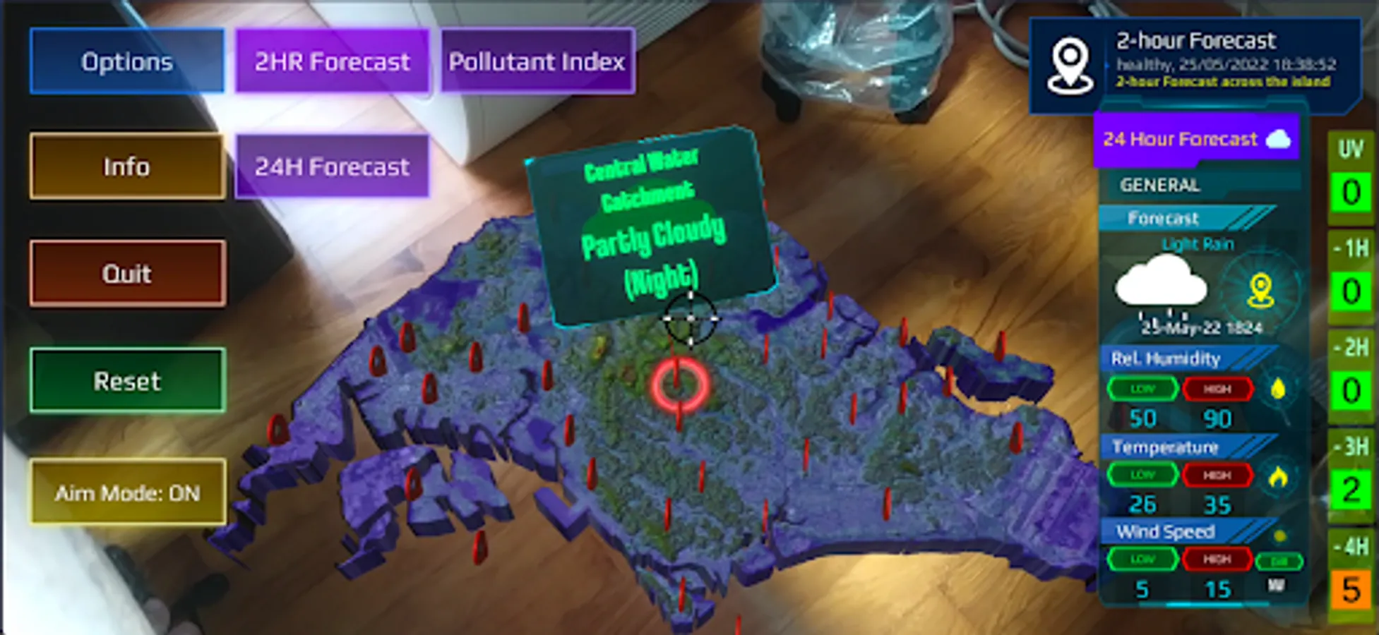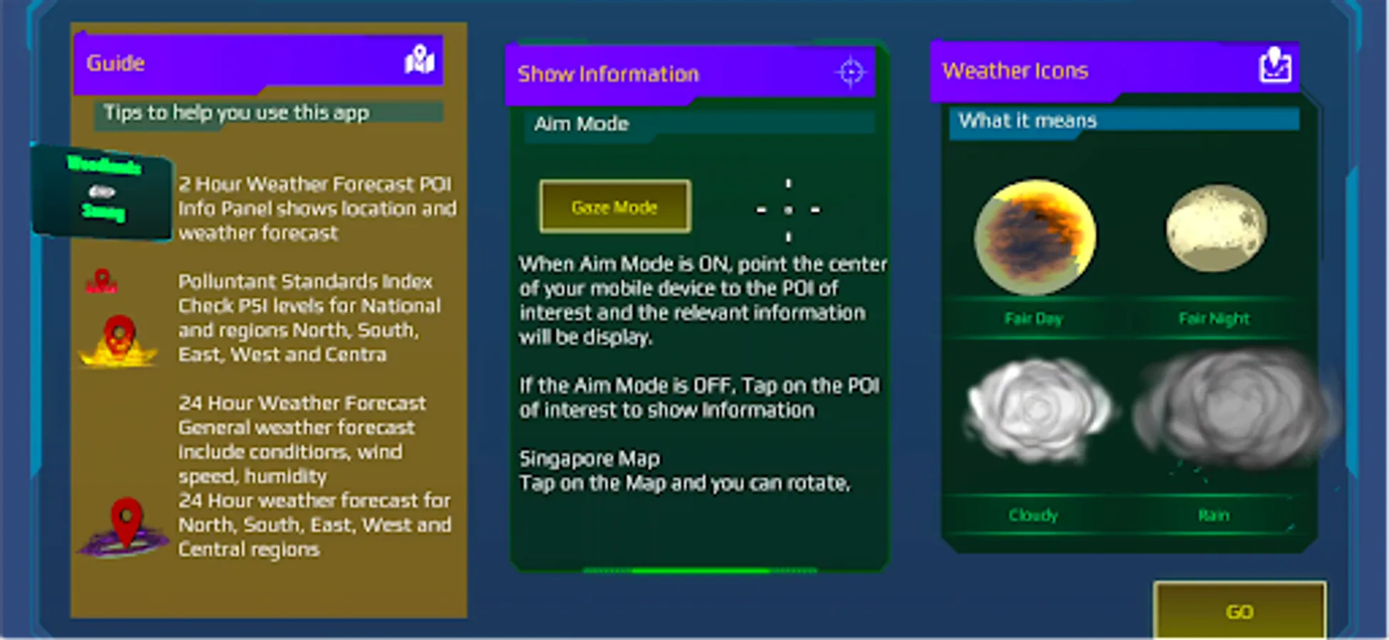 Introducing SGARWA: A beautiful and accurate Weather app that also shows you Weather conditions around you in Augmented Reality. Simply hold your Device up in the direction of the Singapore Map, to see what Weather conditions are like in that area! In addition to Augmented Reality feature, SGARWA includes full Local Weather Forecast and Pollutant Indexes as well. Local Weather includes Current 2H Weather, a 24H Forecast, Ultra Violet Index, Pollutant Standards Index.