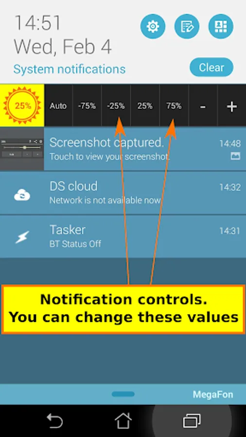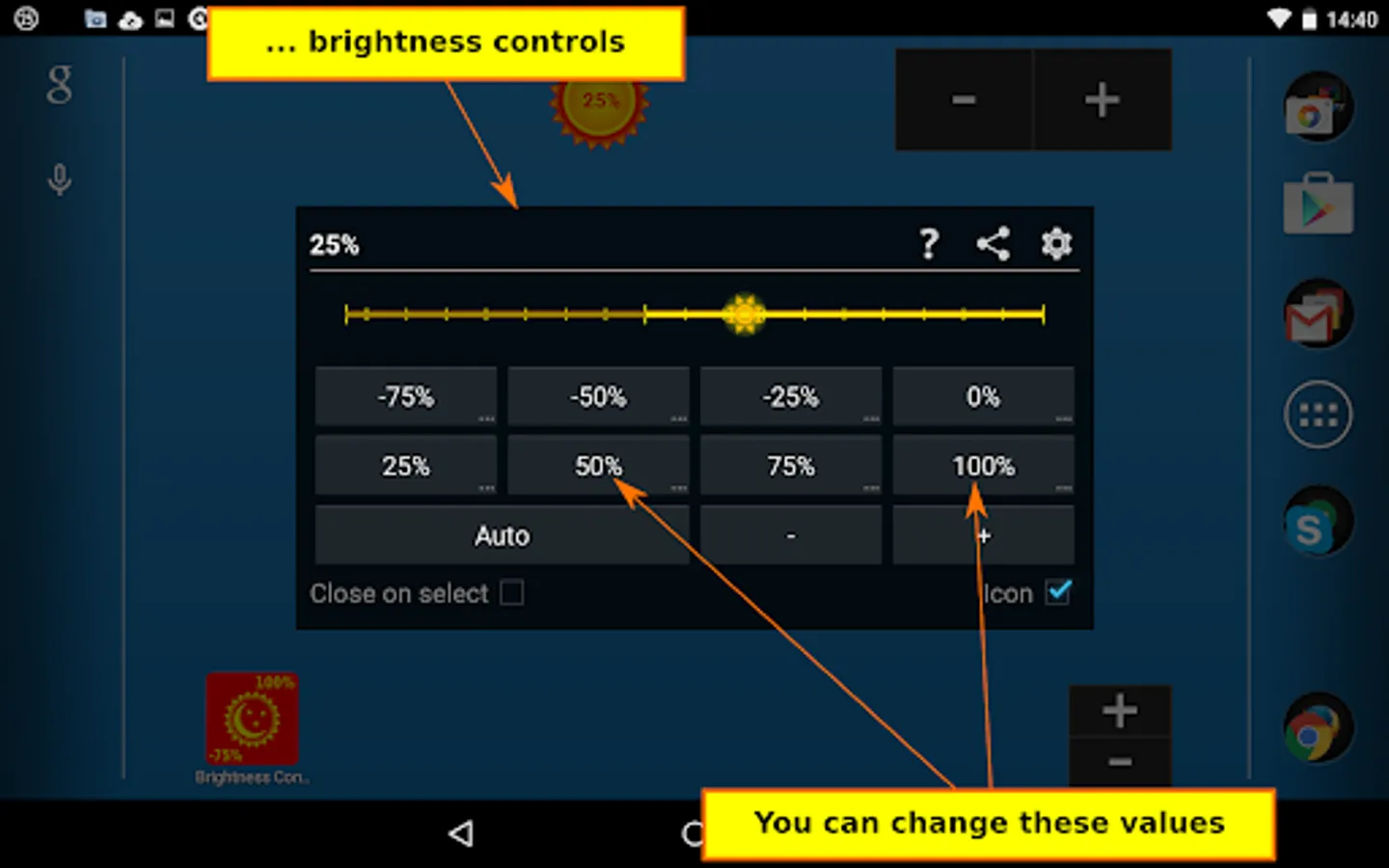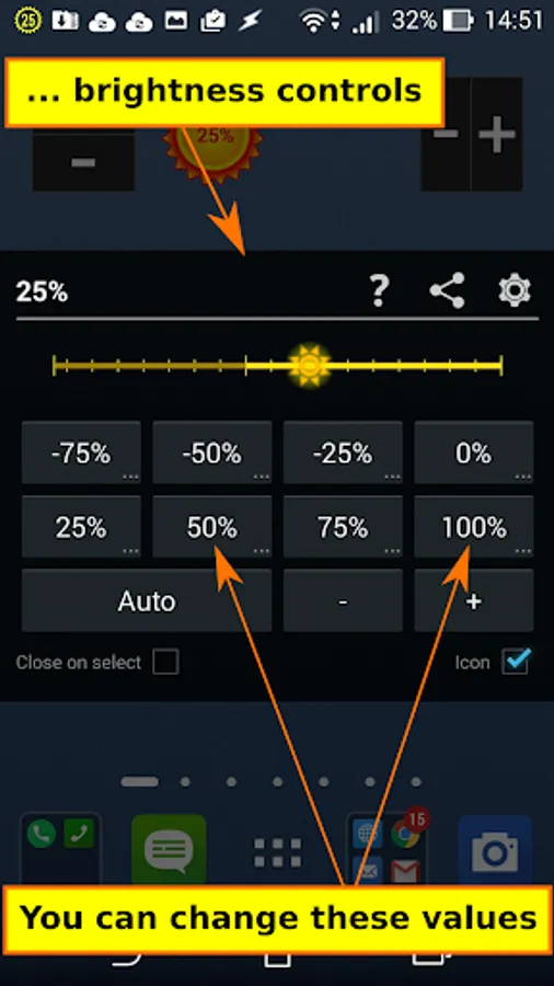 ● Brightness controls in the notification will allow you to quickly control brightness from anywhere (even from games), just open the notification drawer. You can set your custom brightness levels for the quick buttons in the notification too.